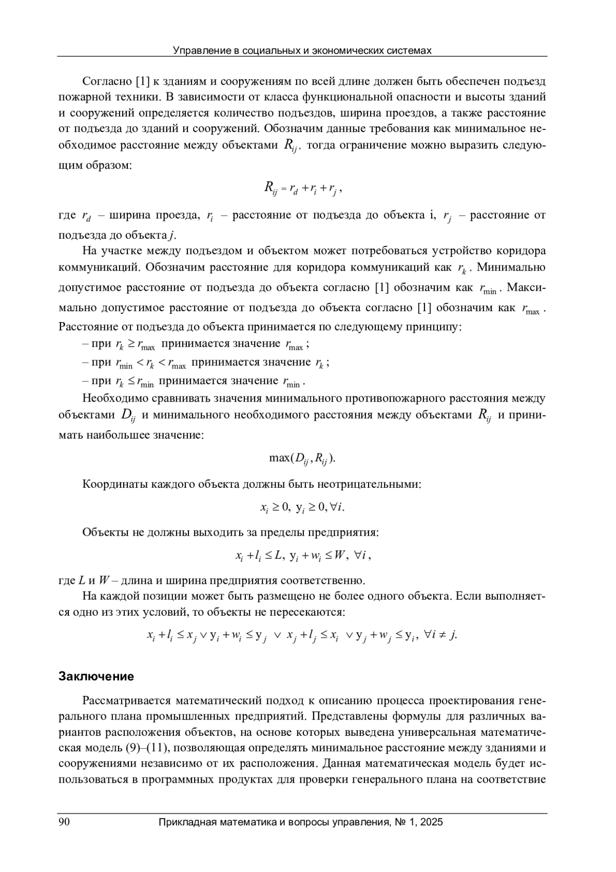 Создание генерального плана является ответственным этапом при проектировании промышленного предприятия. На практике для расстановки объектов на плане (зданий, сооружений и т. д.) используется ручной подход, при котором проектировщики самостоятельно размещают объекты. Создание проекта является творческим процессом, а количество вариантов проектирования может быть достаточно большим. Фактически формируются и сравниваются между собой лишь несколько альтернативных вариантов компоновки, из которых в дальнейшем выбирается наилучший. Однако этот выбор нередко основывается на субъективном мнении специалиста и не всегда гарантирует оптимальное решение. Кроме того, оценка вариантов и принятие окончательного решения зависят от квалификации и опыта задействованных инженеров. В связи с этим необходимо автоматизировать этот процесс для создания более качественных проектов за более короткий срок. Цель данной работы - описать формирование генерального плана с математической точки зрения и создать универсальную математическую модель, подходящую для всех возможных вариантов расположения объектов относительно друг друга. На основе полученных результатов данной работы в будущих исследованиях можно будет определить оптимальные численные методы для размещения объектов на генеральном плане. Эффективность применения методов оптимизации зависит от точности математических моделей, используемых для описания задачи. Модели должны точно отражать все ключевые аспекты реальной ситуации, чтобы результаты оптимизации были пригодны для практического использования.
