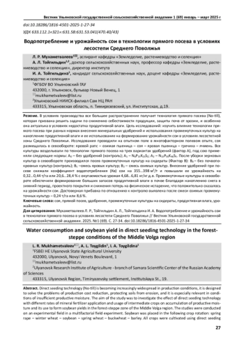В условиях производства все большее распространение получает технология прямого посева (No-till), которая призвана решить задачи по снижению себестоимости продукции, защиты почв от эрозии, и особенно она актуальна в условиях недостатка продуктивной влаги. Цель исследований: изучить влияние технологии прямого посева при разных нормах внесения минеральных удобрений и использования промежуточных культур на накопление продуктивной влаги и ее использование на формирование урожайности сои в условиях лесостепной зоны Среднего Поволжья. Исследования проводили на опытном поле в многофакторном полевом опыте, соя размещалась в севообороте: яровой рапс - озимая пшеница - соя - яровая пшеница - гречиха - ячмень. Все культуры возделывали по технологии прямого посева на трех вариантах удобрений (фактор А), под сою применяли следующие нормы: А0 - без удобрений (контроль); А1 - N6P15K23S2; А2 - N13P3oK46S5. После уборки зерновых культур в севообороте производился посев промежуточных культур на сидераты (Фактор В): В0 - без почвопокровных культур (контроль); В1 -смесь яровых культур; В2 - смесь озимых культур. Внесение удобрений при посеве снижали коэффициент водопотребления (Кв) сои на 355…398 м3/т и повышали ее урожайность на 0,32…0,44 т/га или 20,6.28,4 % с окупаемостью урожая 4,68.6,81 кг/кг д. в. Промежуточные культуры в севообороте обеспечили формирование больших запасов продуктивной влаги в почве благодаря накоплению снега в зимний период, проектного покрытия и снижения потерь на физическое испарение, что положительно сказалось на урожайности сои. Достоверная прибавка по отношению к контролю выявлена после смеси озимых промежуточных культур - 0,24 т/га или 8,6 %.