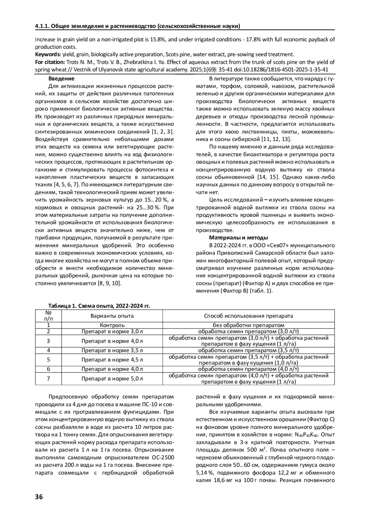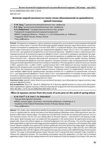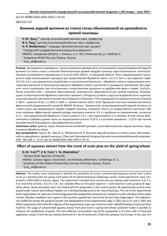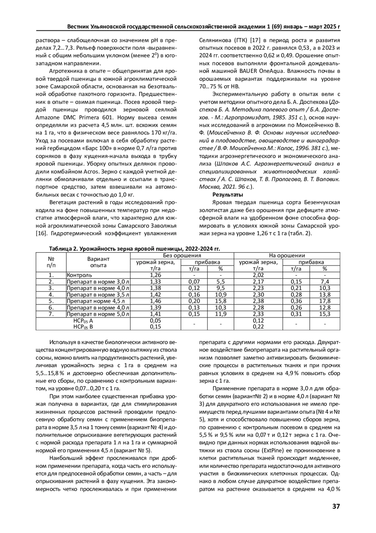 Исследования проводили с целью выявления возможности использования концентрированной водной вытяжки из ствола сосны в качестве биостимулятора яровой твердой пшеницы сорта Безенчукская золотистая. Полевые эксперименты проводились в течение 2022-2024 гг. в Самарской области. Опыт предусматривал три варианта норм использования препарата для предпосевной обработки семян: 3,0; 3,5; 4,0 л и три варианта норм: 4,0; 4,5; 5,0 л. для двукратного воздействия на растительный организм - обработки семян и опрыскивания вегетирующих растений. В контрольном варианте обработку семян и растений не проводили препаратом. Все варианты опыта размещали при естественном и искусственном орошении на удобренном фоне в норме: N40P40K40. Почва опытного поля - чернозем обыкновенный. Агротехника- общепринятая для яровой пшеницы, базирующаяся на безотвальной обработке пахотного горизонта. Погодные условия в годы исследований были характерными для южной агроклиматической зоны Самарского Заволжья. ГТК в период роста и развития опытных посевов в 2022 г. равнялся 0,53, а в 2023 и 2024 гг. соответственно 0,62 и 0,49. Орошение опытных посевов выполняли фронтальной дождевальной машиной BAUER OneAqua. Применение концентрированной водной вытяжки из ствола сосны при выращивании яровой твердой пшеницы позволяет влиять на продуктивность растений. При этом наиболее эффективной нормой расхода препарата является 4,5 л с дробным ее применением, используя 3,5 л - для предпосевной обработки 1 тонны семян и 1,0 л - для опрыскивания 1 га посевов. В этом случае обеспечивается прибавка урожая зерна на неорошаемом участке 15,8 %, а в условиях орошения - 17,8 % при полной экономической окупаемости производственных затрат.