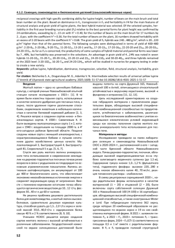 Создание сортов желтого кормового люпина универсального типа использования конкретно для дерново - подзолистых песчаных почв легкого механического состава юго-запада Брянской области весьма актуально как в плане высокобелковой кормовой культуры для животноводства, так и поддержания уровня их плодородия. Для гибридизации привлекли родительские формы местной селекции в реципрокные скрещивания, имеющих высокую специфическую комбинационную способность по высоте люпина, количеству бобов на главной кисти и всего на растении. На основе доминирования в F1, трансгрессии в F2 и наследуемости в F4 по основным признакам структурного анализа и урожайности зерна растений люпина проведены отборы лучших гибридного материала. Из отобранных образцов наследуемость в селекционном питомнике первого года (F4) относительно лучших родительских форм по высоте растений подтвердили 24 комбинации, превысив на 2…13 см с h2 = 0,40, по количеству бобов на главной кисти у 17 номеров на 2.6 шт. с коэффициентом h2 = 0,36. По общему количеству бобов на растении 16 номеров проявили наследуемость с превышением на 2-20 бобов с коэффициентом h2 = 0,68. Урожай зерна у гибридов F3 составил 240.480 г/м2, что выше родительских форм на 20.220 г/м2. С урожайностью 400 - 480 г/м2 выделились образцы 2-20-82с, 3-20-382а, 9-20-734в, 11-20-522с, 13-20-1 и 94в, 17-20132с, 17-20-164в, 22-20-20 и 254d, 20-20-532с, 24-20-1552с. В F4 продуктивность у некоторых образцов гибридного материала и родительских форм оказалась ниже на 7.49 %, но наследуемость у отборов сохранилась. Отмечено преимущество по урожайности зерна на 4.24 % у семи гибридов 11-20-102с, 15-20-72с, 20-20-1142с, 22-20-13 и 232с, 24-20-1102с и 30-20-402а, и три гибрида остались на уровне 2023 г.: 3-20-1022с, 16-20-74в и 24-20-1342с, которые будут исследоваться в питомниках испытания потомств с целью создания нового сорта.