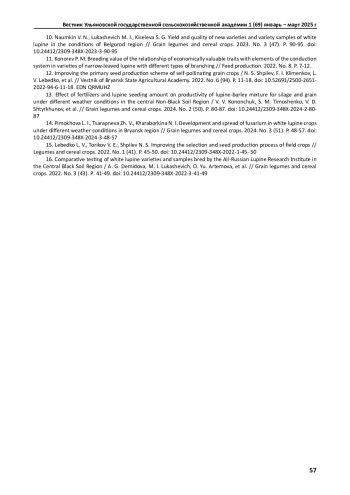 10. Наумкин В. Н., Лукашевич М. И., Киселева С. Г. Урожайность и качество новых сортов и сортообразцов люпина белого в условиях Белгородской области // Зернобобовые и крупяные культуры. 2023. № 3 (47). С. 90-95. DOI: 10.24412/2309-348X-2023-3-90-95 EDN: MJCPYJ