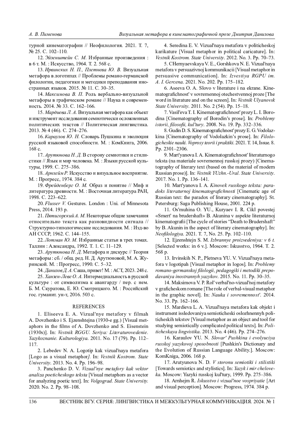 1. Елисеева Е. А. Визуальные метафоры в фильмах А. Довженко и С. Эйзенштейна (1930-е гг.) // Вестник РГГУ Сер.: Литературоведение. Языкознание. Культу -рология. 2011. № 17 (79). С. 112-117.