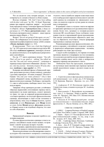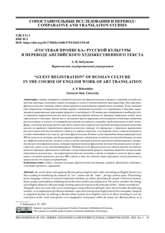 Статья посвящена употреблению русских фразеологизмов в процессе перевода английского текста, вносящих элементы «своей» культуры в «чужое» художественное пространство. Как известно, фразеологические единицы любого языка являются важнейшими атрибутами культуры. В них находит свое отражение историческая помять народа, содержатся аллюзии к его традициям и обычаям, выражаются нравственные ориентиры прошлого и настоящего. В статье рассматривается подбор русского образного выражения вместо той или иной английской идиомы по принципу выявления между ними «фамильного сходства». Кроме того, изучаются другие варианты использования устойчивых оборотов русского языка, а именно: а) употребление вместо английского универба, представленного в виде метафоры, сленгизма или жаргонизма, при этом слово в своем переносном значении воспринимается в качестве намека на вводимую переводчиком фразеологическую единицу; б) обращение к образному выражению русского языка вместо английского слова в его прямом значении, если перевод этого слова включается в состав «подходящего по смыслу» русского фразеологизма. В этом случае переводчик домысливает русскую ФЕ до полного ее состава, как бы раскрывая образное содержание исходной лексической единицы; в) тот же эффект имеет место, когда не слово, а целая ситуация в тексте оригинала подталкивает к употреблению русского фразеологизма, который придает данному фрагменту текста дополнительную экспрессивность, ранее в нем отсутствовавшую. Подбор русских фразеологических единиц вместо английских идиом по принципу «фамильного сходства», осуществляемый в процессе перевода, является, на наш взгляд, единственно возможным - он непроизвольно вносит элементы «своей» культуры в «чужую; другие варианты «гостевой прописки» русских ФЕ в одном и том же тексте языка оригинала могут разниться в зависимости от замысла переводчика.