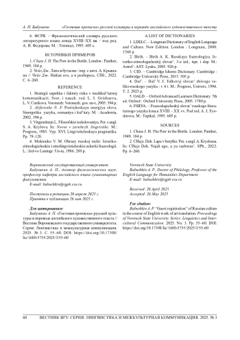 4. Мокиенко В. М. Образы русской речи : историко-этимологические и этнолингвистические очерки фразеологии. Л. : Изд-во Ленингр. ун-та, 1986. 280 с.