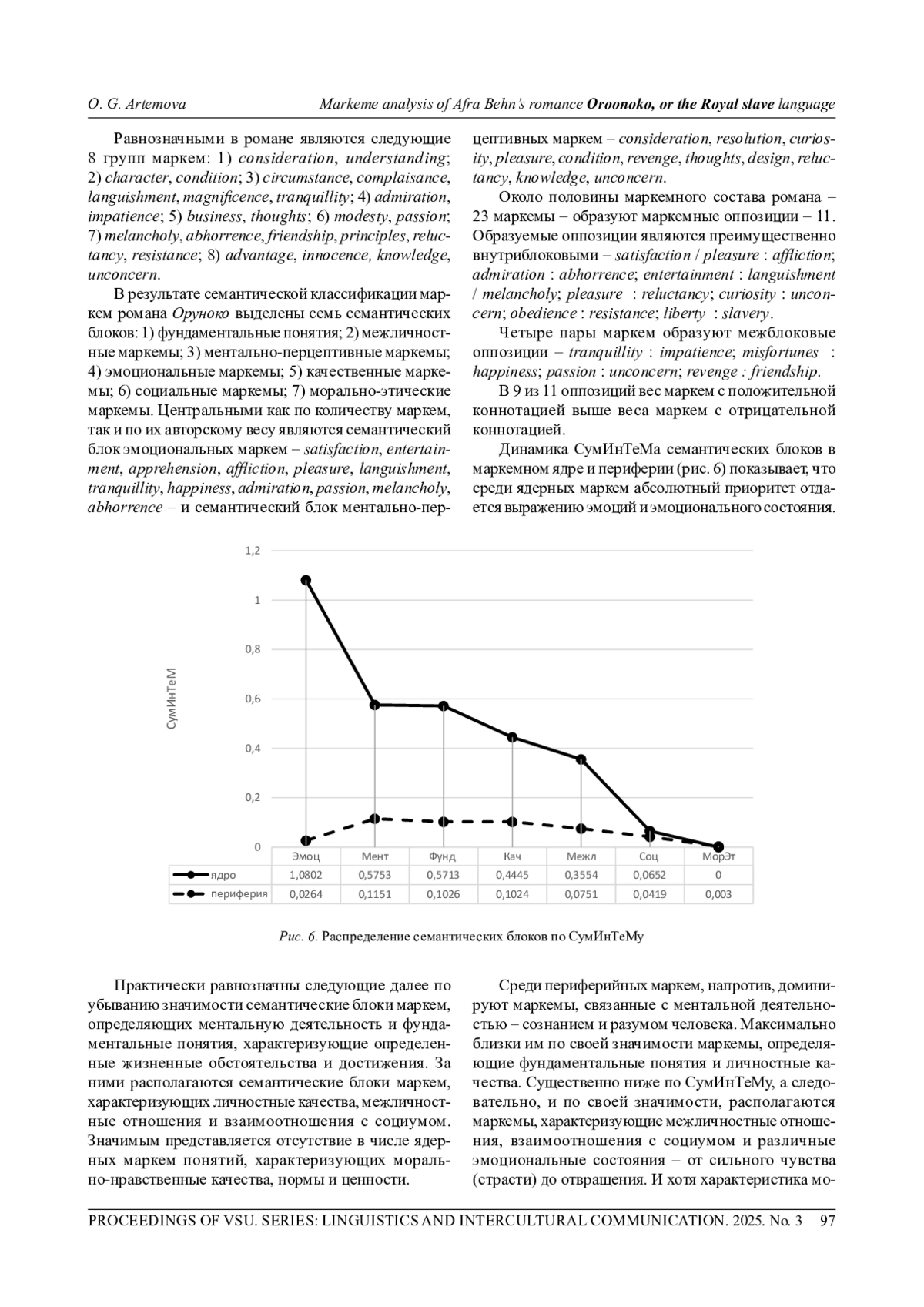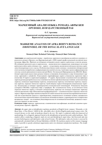 Цель предлагаемой статьи - определениемаркемного своеобразия английского галантно-героического романа «Оруноко, или Царственный раб» (1688) первой профессиональной английской писательницы Афры Бен. Предмет исследования составляет анализ маркем, выделенных в тексте романа. Исследование выполнено в русле маркемологии - лингвистического направления, позволяющего на основе выделения особого вида ключевых слов - маркем - осуществить лингвистический анализ текста и выделить доминирующие в нем смыслы. Особенностью данного вида ключевых слов является одновременный учет частоты употребления и информативности каждой лексемы. Средством оценки информативности лексемы служит автоматически вычисляемый Индекс Текстуальной Маркированности (ИнТеМ). Проведенный маркемный анализ языка романа позволил установить доминантную и вице-доминантную маркемы: opportunity и satisfaction. В результате стратификации маркем установлены маркемное ядро в количестве 23 маркем и маркемная периферия - 27 маркем. В результате семантической классификации маркемы романа распределены в семь семантических блоков: фундаментальные понятия, межличностные маркемы, ментально-перцептивные маркемы, эмоциональные маркемы, качественные маркемы, социальные маркемы, морально-этические маркемы. Среди ядерных маркем доминируют эмоциональные маркемы., большинство из которых характеризуется положительной коннотацией. Установлена динамика суммарного ИнТеМа в маркемном ядре и периферии. Все семантические блоки, за исключением блока морально-этических маркем, в большей (эмоциональные маркемы) или меньшей (социальные маркемы) степени тяготеют к ядру. Единственный периферийный блок - семантический блок морально-этических маркем. Маркемы ядра ядра свидетельствуют об особой значимости наличия благоприятной возможности для осуществления замысла и характеристики эмоционального состояния человека, вызываемого межличностным взаимодействием или внешними обстоятельствами и характеризуемого полярностью вызываемых эмоций - от состояния удовлетворенности до состояния беспокойства, вызванного опасением или страхом за свою жизнь.