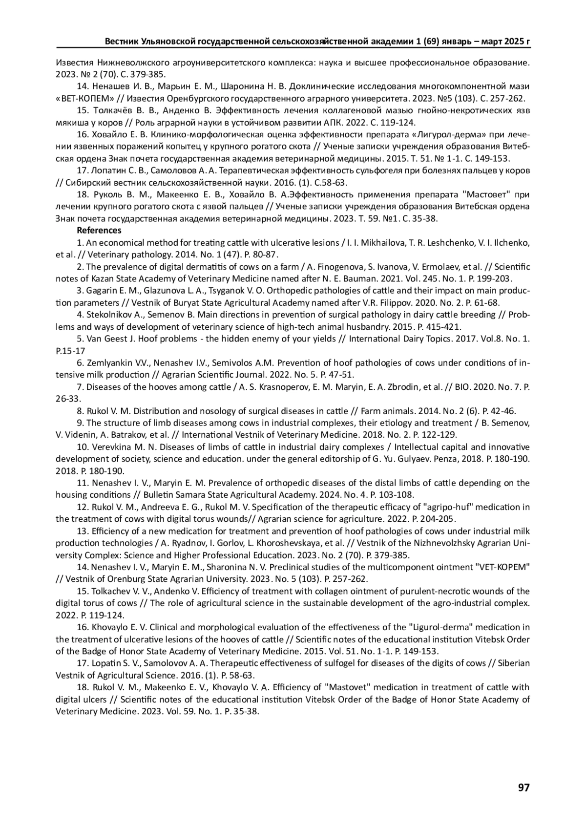 17. Лопатин С. В., Самоловов А. А. Терапевтическая эффективность сульфогеля при болезнях пальцев у коров // Сибирский вестник сельскохозяйственной науки. 2016. (1). С.58-63. EDN: VRCQWV