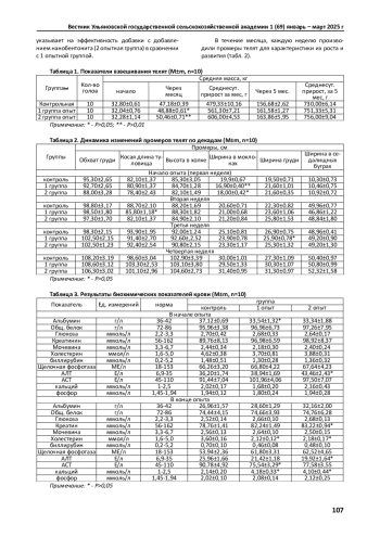 Цель исследования - изучить влияние наноструктурного бентонита на рост, развитие, физиологический статус и биохимические показатели крови телят. Исследование проведено в Республике Татарстан. Объектами исследований были телята черно-пестрой породы, отобранные по принципу аналогов, которые были разделены на 3 группы (контрольная и 2 опытные) по 10 животных в каждой. Животные содержались в одинаковых условиях, и их рационы кормления соответствовали принятым в хозяйстве. Контрольная группа получала основной рацион. Первой опытной группе телят к основному рациону добавляли АсидоБио-ЦИТ- 10 мл/гол. Вторая опытная группа ежедневно получала к основному рациону АсидоБио-ЦИТ -10 мл/гол и нанобентонит в количестве 20 грамм на голову. К первому месяцу эксперимента средняя масса телят в контрольной группе составляла 47,18±0,39 кг, в первой опытной группе 48,88±0,61 кг (Р>0,05), во второй -50,46±0,71 кг (Р>0,01). Относительный прирост в контроле составил 43,84 %, в первой опытной - 52,56 %, во второй опытной группе - 56,32 %, что на 8,72 и 12,48 % больше контроля соответственно. Лучшие показатели по снижению ферментов печени АЛТ также были во 2 опытной группе - на 54,16 % (Р>0,05).
