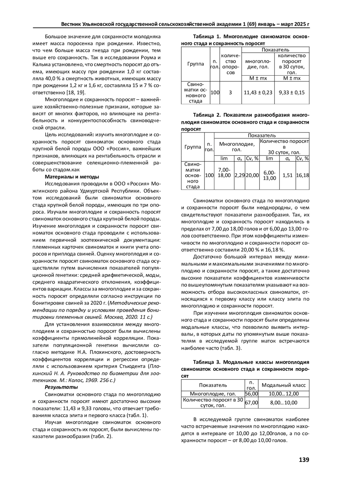 Исследования были проведены в племенном заводе в Удмуртской Республике. Объектом исследований были свиноматки основного стада крупной белой породы в количестве 100 голов, имеющих по три опороса. Изучали многоплодие свиноматок основного стада и сохранность поросят. Использовали племенные карточки свиноматок и книги учета опоросов и приплода свиней. Для изучения многоплодия свиноматок основного стада и сохранности поросят вычисляли показатели вариационной статистики: средняя арифметическая, коэффициенты изменчивости и корреляции. Оценивая многоплодие свиноматок основного стада и сохранность поросят, было выявлено, что они соответствуют классу элита и первому классу. Так средний показатель по многоплодию составил 11,43 поросенка, а среднее количество поросят в 30 суток 9,33 головы. Изучая показатели разнообразия по многоплодию и сохранности поросят, было выявлено, что свиноматки основного стада по данным признакам репродуктивных качеств неоднородны. Так коэффициенты изменчивости по многоплодию и сохранности поросят соответственно составили - 20,00 % и 16,18 %. Вычисляя коэффициенты прямолинейной корреляции между многоплодием и количеством поросят в разные возрастные периоды, было выявлено, что взаимосвязь между упомянутыми выше признаками с возрастом понижается. Так, коэффициент корреляции между многоплодием и количеством поросят в возрасте 3-х суток составил (г =+ 0,507), а в возрасте 30-и дней (г =+ 0,442) при (P>0,999), что указывает на то, что отбор высококлассных свиноматок по многоплодию позволит повысить сохранность поросят при условии полноценного кормления животных в подсосный период.