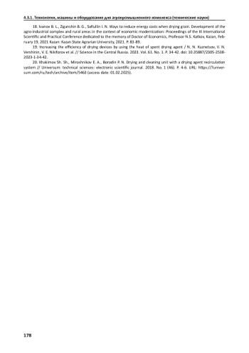 18. Иванов Б. Л., Зиганшин Б. Г., Сафиуллин И. Н. Пути снижения энергетических затрат при сушке зерна. Развитие АПК и сельских территорий в условиях модернизации экономики: Материалы III Международной научно-практической конференции, посвященной памяти д.э.н., профессора Н.С. Каткова, Казань, 19 февраля 2021 г. Казань: Казанский государственный аграрный университет, 2021. С. 83-89. EDN: DVMMSZ