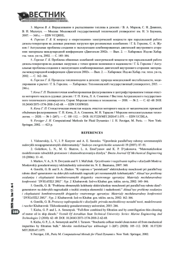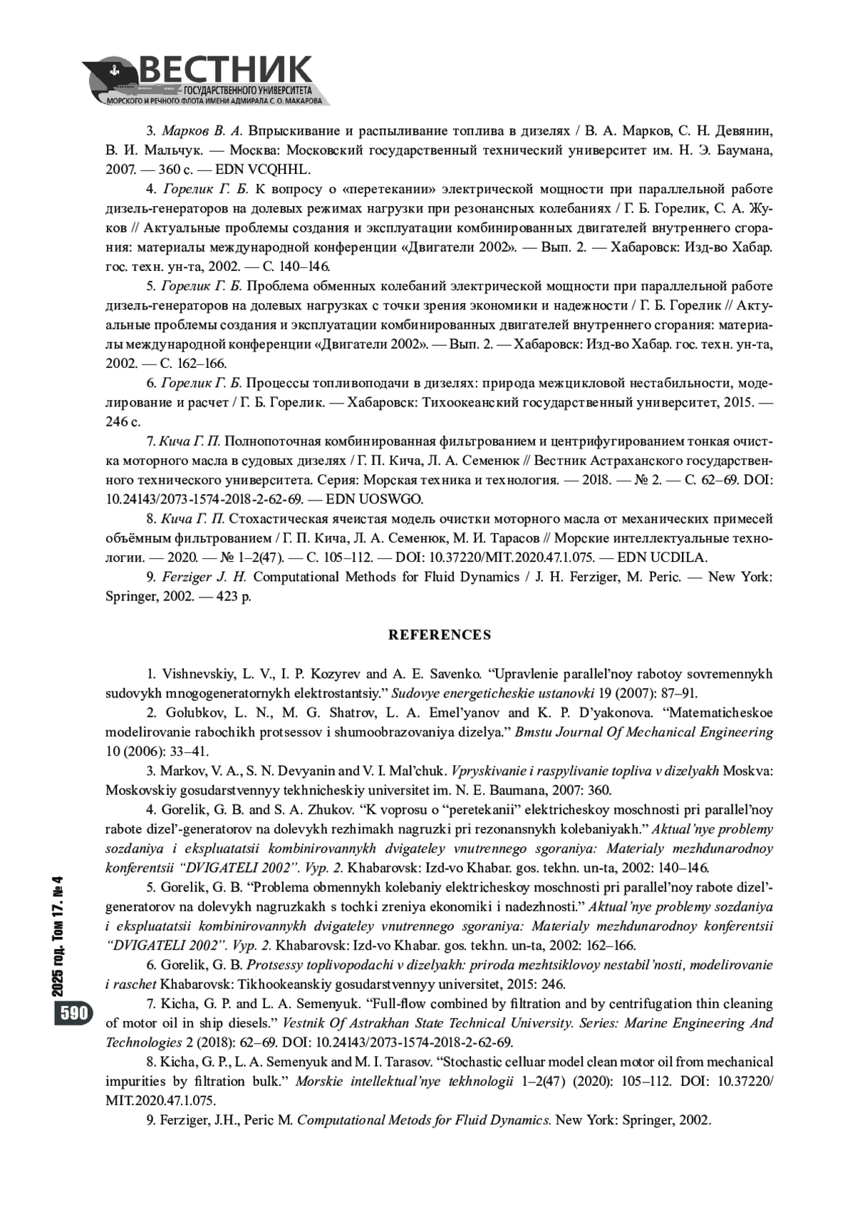 7. Кича Г. П. Полнопоточная комбинированная фильтрованием и центрифугированием тонкая очистка моторного масла в судовых дизелях / Г. П. Кича, Л. А. Семенюк // Вестник Астраханского государственного технического университета. Серия: Морская техника и технология. - 2018. - № 2. - С. 62-69. https://doi.org/10.24143/2073-1574-2018-2-62-69. - EDN UOSWGO.