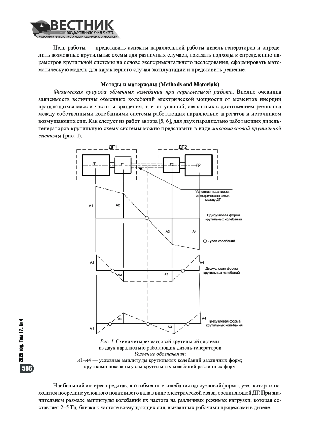 Рассмотрены проблемы, связанные с взаимными перетеканиями электрической энергии между несколькими дизель-генераторов переменного тока при их параллельной работе. Отмечается, что амплитуда электроэнергии в ряде случаев приводит к аварийным ситуациям, снижает эффективность эксплуатации агрегатов и их надежность. Колебания режимных параметров вызывают пульсацию напряжения, снижают коэффициент полезного действия агрегатов, ограничивают использование полной мощности, оказывают отрицательное психофизиологическое воздействие на персонал, приводят к повышенному износу агрегатов. Понимание сути происходящих процессов и физической природы обменных колебаний позволяют принимать соответствующие технические решения, выполнять опытно-конструкторские разработки и обеспечивать безопасность эксплуатации дизель-электрических агрегатов при их параллельной работе. Из представленной математической модели двух параллельно работающих дизель-генераторов следует, что обменные колебания, узел которых находится посредине условного податливого вала в виде электрической связи, соединяющей ДГ, имеют одноузловую форму. Обращается внимание на то, что при значительном размахе амплитуды колебаний их частота на различных режимах нагрузки близка к частоте возмущающих сил, вызванных рабочими процессами в дизеле. Отмечается, что в упрощенной крутильной системе для параллельной работы группы ДГ на мощную электрическую сеть следует рассматривать каждый агрегат в качестве одномассовой крутильной системы. Сделан вывод о том, что собственная частота одноузловой формы колебаний имеет один узел в зоне условной электрической связи между генераторами. Рассмотрены резонансные колебания в системе, возникающие из-за неустойчивости рабочего процесса вследствие нестабильной работы топливной аппаратуры от цикла к циклу, которые приводят к повышенному перетеканию электрической энергии между параллельно работающими дизель-генераторами. Это явление сопровождается, как правило, снижением эффективности установки в целом.