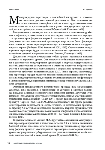 22. Лебедева М.М., Зиновьева Е.С. 2023. Специфика международных переговоров в эпоху цифровизации. Вестник Российского университета дружбы народов. Серия: Международные отношения. 23(1). C. 144-156. https://doi.org/10.22363/2313-0660-2023-23-1-144-156 Маркетти Р. 2022. Дипломатия городов. Москва: КноРус. 154 с.