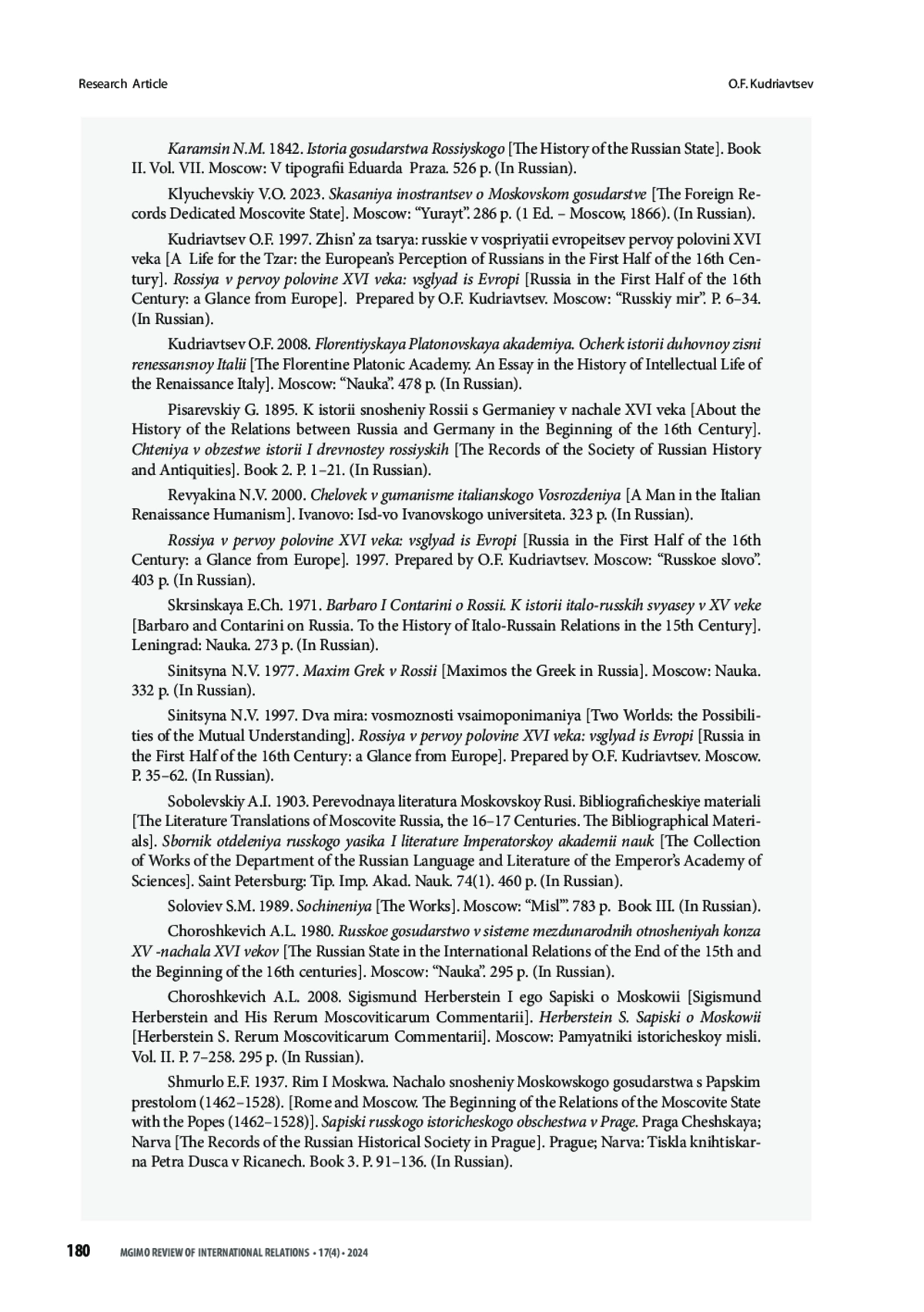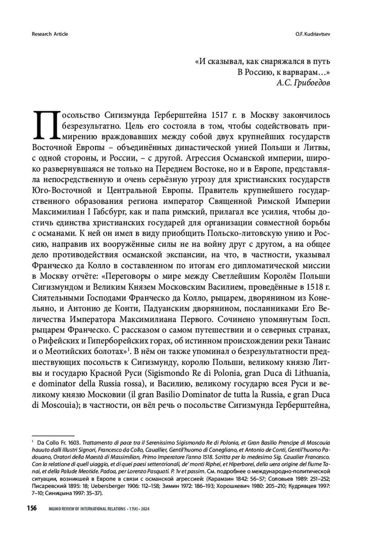 КУДРЯВЦЕВ О. Ф. НЕУДАВШЕЕСЯ МИРОТВОРЧЕСТВО: МИССИЯ ФРАНЧЕСКО ДА КОЛЛО И АНТОНИО ДЕ КОНТИ В МОСКВУ (1518–1519) // ВЕСТНИК МГИМО-УНИВЕРСИТЕТА. 2024. ТОМ 17, № 4