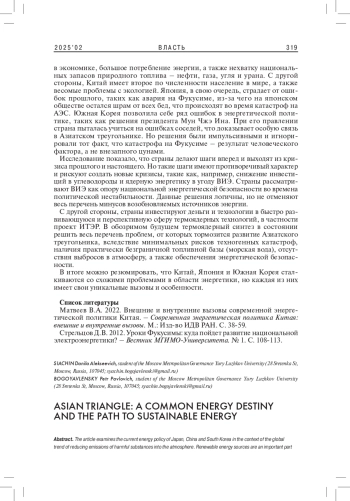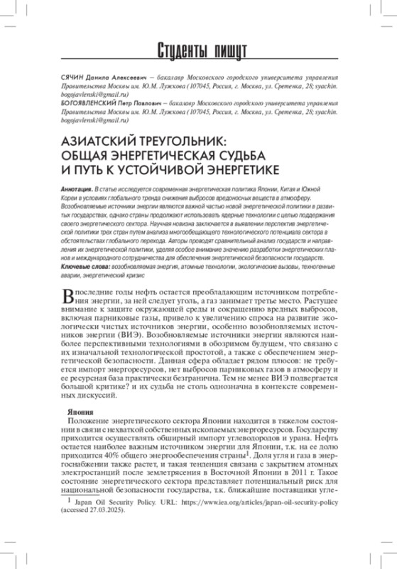 В статье исследуется современная энергетическая политика Японии, Китая и Южной Кореи в условиях глобального тренда снижения выбросов вредоносных веществ в атмосферу. Возобновляемые источники энергии являются важной частью новой энергетической политики в развитых государствах, однако страны продолжают использовать ядерные технологии с целью поддержания своего энергетического сектора. Научная новизна заключается в выявлении перспектив энергетической политики трех стран путем анализа многообещающего технологического потенциала сектора в обстоятельствах глобального перехода. Авторы проводят сравнительный анализ государств и направления их энергетической политики, уделяя особое внимание значению разработки энергетических планов и международного сотрудничества для обеспечения энергетической безопасности государств.