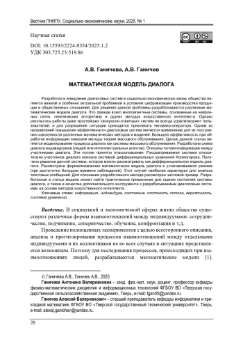 ГАНИЧЕВА А. В., ГАНИЧЕВ А. В. МАТЕМАТИЧЕСКАЯ МОДЕЛЬ ДИАЛОГА // ВЕСТНИК ПЕРМСКОГО НАЦИОНАЛЬНОГО ИССЛЕДОВАТЕЛЬСКОГО ПОЛИТЕХНИЧЕСКОГО УНИВЕРСИТЕТА. СОЦИАЛЬНО-ЭКОНОМИЧЕСКИЕ НАУКИ. 2025. № 1