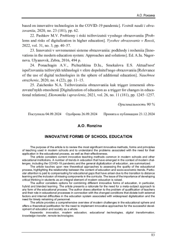 Представлен обзор наиболее значимых инновационных методов, форм и принципов обучения, применяемых в современных школах, и осмысление проблем, связанных с необходимостью их применения, внедрением в образовательный процесс, а также их эффективностью. Рассмотрены актуальные инновационные методы обучения, распространенные в современной школе и других образовательных и воспитательных учреждениях. Обобщен ряд тенденций в образовании, возникших в условиях современных вызовов, включая пандемию COVID-19 и всеобщую цифровизацию образования. Представлены новые теоретические подходы к оценке качества образовательного процесса, показана связь содержания образования с социально-экономическими тенденциями. Особое внимание уделено компенсации образовательных пробелов, возникших из-за перехода на дистанционное обучение, и включению недостающих компонентов в учебные программы. Рассмотрен вопрос о значении формирования у учащихся критического мышления как неотъемлемого элемента современного образования. Приведены варианты совмещения разных инновационных форм обучения, в частности, гибридное и смешанное обучение. Представлено обоснование необходимости метапредметного подхода к любым формам образовательного процесса. Обращено внимание на проблему квалификации педагогов и их роли в образовательных процессах в связи с изменившимися условиями, которые диктуют как внешние факторы, так и внутренние сложности в системе образования, связанные с повсеместной цифровизацией и необходимостью своевременной переподготовки кадров. Проведен всесторонний обзор современных вызовов в образовательной сфере и теоретически обоснована необходимость внедрения инновационных подходов для успешного развития образования и общества в целом.