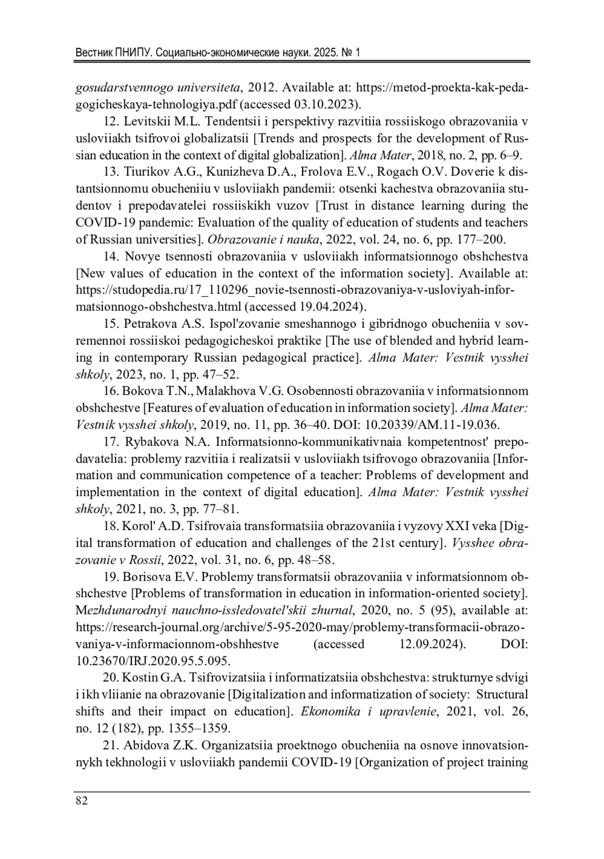 25. Заиченко, Н.А. Цифровизация образования как триггер изменений обра-зовательных отношений / Н.А. Заиченко // Экономика и управление. - 2021. - Т. 26, № 11 (181). - С. 1245-1257.