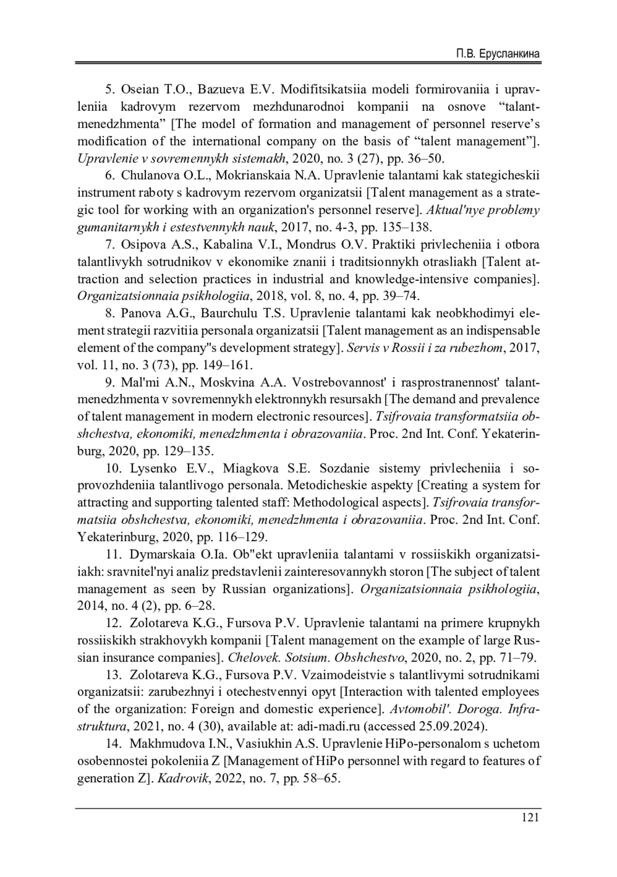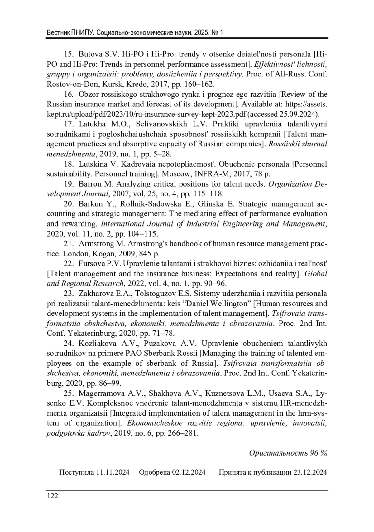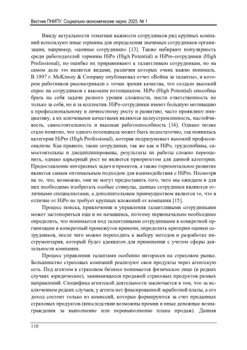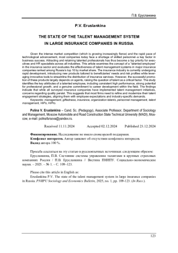 ЕРУСЛАНКИНА П. В. СОСТОЯНИЕ СИСТЕМЫ УПРАВЛЕНИЯ ТАЛАНТАМИ В КРУПНЫХ СТРАХОВЫХ КОМПАНИЯХ РОССИИ // ВЕСТНИК ПЕРМСКОГО НАЦИОНАЛЬНОГО ИССЛЕДОВАТЕЛЬСКОГО ПОЛИТЕХНИЧЕСКОГО УНИВЕРСИТЕТА. СОЦИАЛЬНО-ЭКОНОМИЧЕСКИЕ НАУКИ. 2025. № 1
