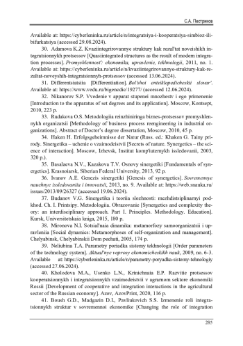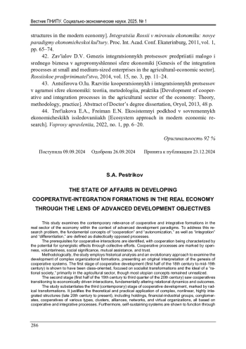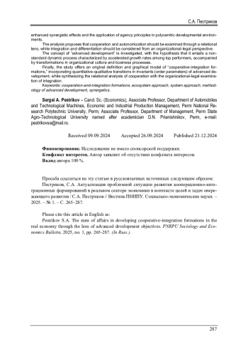 ПЕСТРИКОВ С. А. АКТУАЛИЗАЦИЯ ПРОБЛЕМНОЙ СИТУАЦИИ РАЗВИТИЯ КООПЕРАЦИОННО-ИНТЕГРАЦИОННЫХ ФОРМИРОВАНИЙ В РЕАЛЬНОМ СЕКТОРЕ ЭКОНОМИКИ В КОНТЕКСТЕ ЦЕЛЕЙ И ЗАДАЧ ОПЕРЕЖАЮЩЕГО РАЗВИТИЯ // ВЕСТНИК ПЕРМСКОГО НАЦИОНАЛЬНОГО ИССЛЕДОВАТЕЛЬСКОГО ПОЛИТЕХНИЧЕСКОГО УНИВЕРСИТЕТА. СОЦИАЛЬНО-ЭКОНОМИЧЕСКИЕ НАУКИ. 2025. № 1