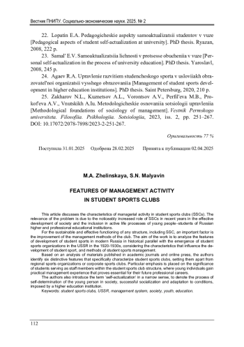 ЖЕЛИНСКАЯ М. А., МАЛЯВИН С. Н. ОСОБЕННОСТИ УПРАВЛЕНЧЕСКОЙ ДЕЯТЕЛЬНОСТИ В СТУДЕНЧЕСКИХ СПОРТИВНЫХ КЛУБАХ // ВЕСТНИК ПЕРМСКОГО НАЦИОНАЛЬНОГО ИССЛЕДОВАТЕЛЬСКОГО ПОЛИТЕХНИЧЕСКОГО УНИВЕРСИТЕТА. СОЦИАЛЬНО-ЭКОНОМИЧЕСКИЕ НАУКИ. 2025. № 2