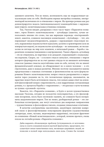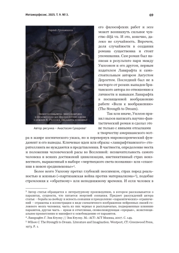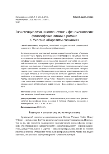В статье проводится комплексный анализ романа Колина Уилсона «Паразиты сознания» через призму экзистенциальной философии и концепции Нового экзистенциализма. Рассматриваются ключевые философские стороны романа: метафорическое представление паразитов сознания в качестве ограничителей человеческого потенциала и роль феноменологического метода в преодолении эволюционных ограничений, укрепляемых современным культурным кодом и ценностями в контексте главного экзистенциальной задачи – вопроса смысла существования. Произведение предстает как новеллизация философских идей Уилсона, в которой пристальное внимание уделяется таким аспектам Нового экзистенциализма, как эволюционная теория, пиковой психология Маслоу и феноменология метод. Роман «Паразиты сознания» рассматривается не только как полемическое высказывание, но и примечательный образец межжанрового сплетения двух видов письма – философского и художественного.