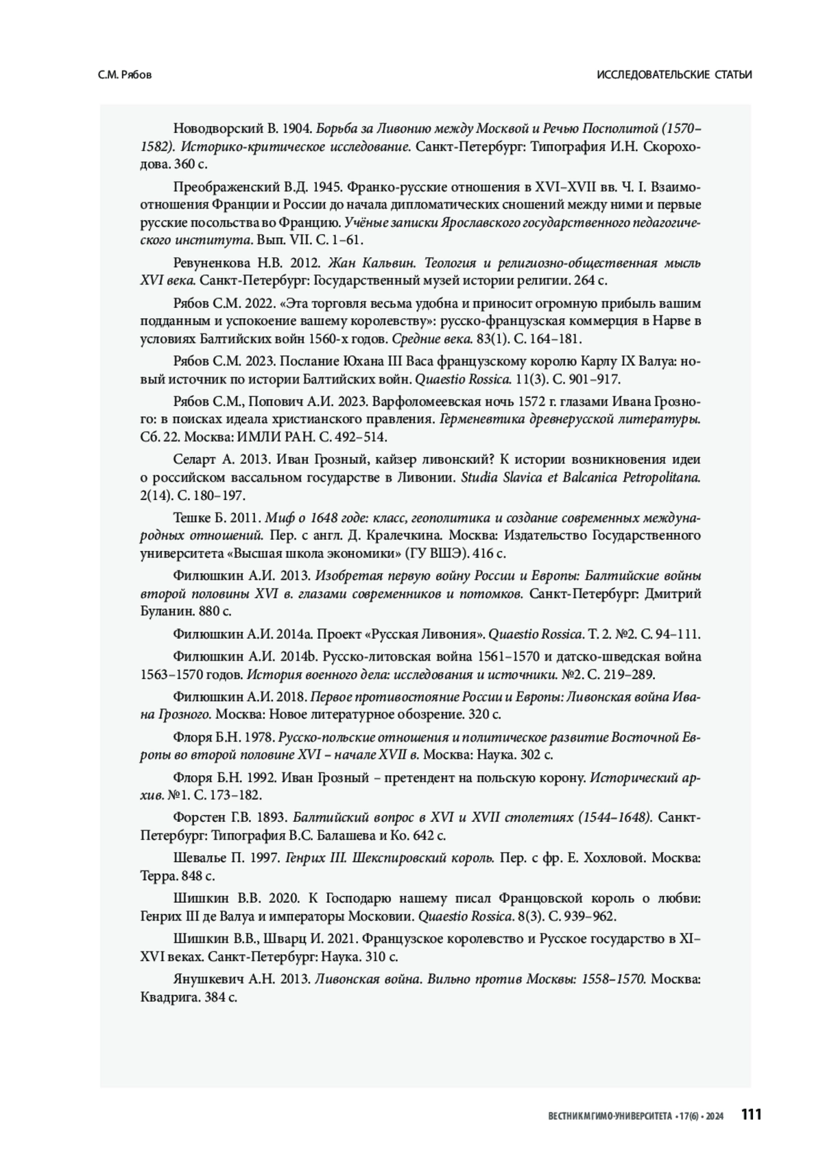 43. Рябов С.М. 2023. Послание Юхана III Васа французскому королю Карлу IX Валуа: новый источник по истории Балтийских войн. Quaestio Rossica. 11(3). С. 901-917.