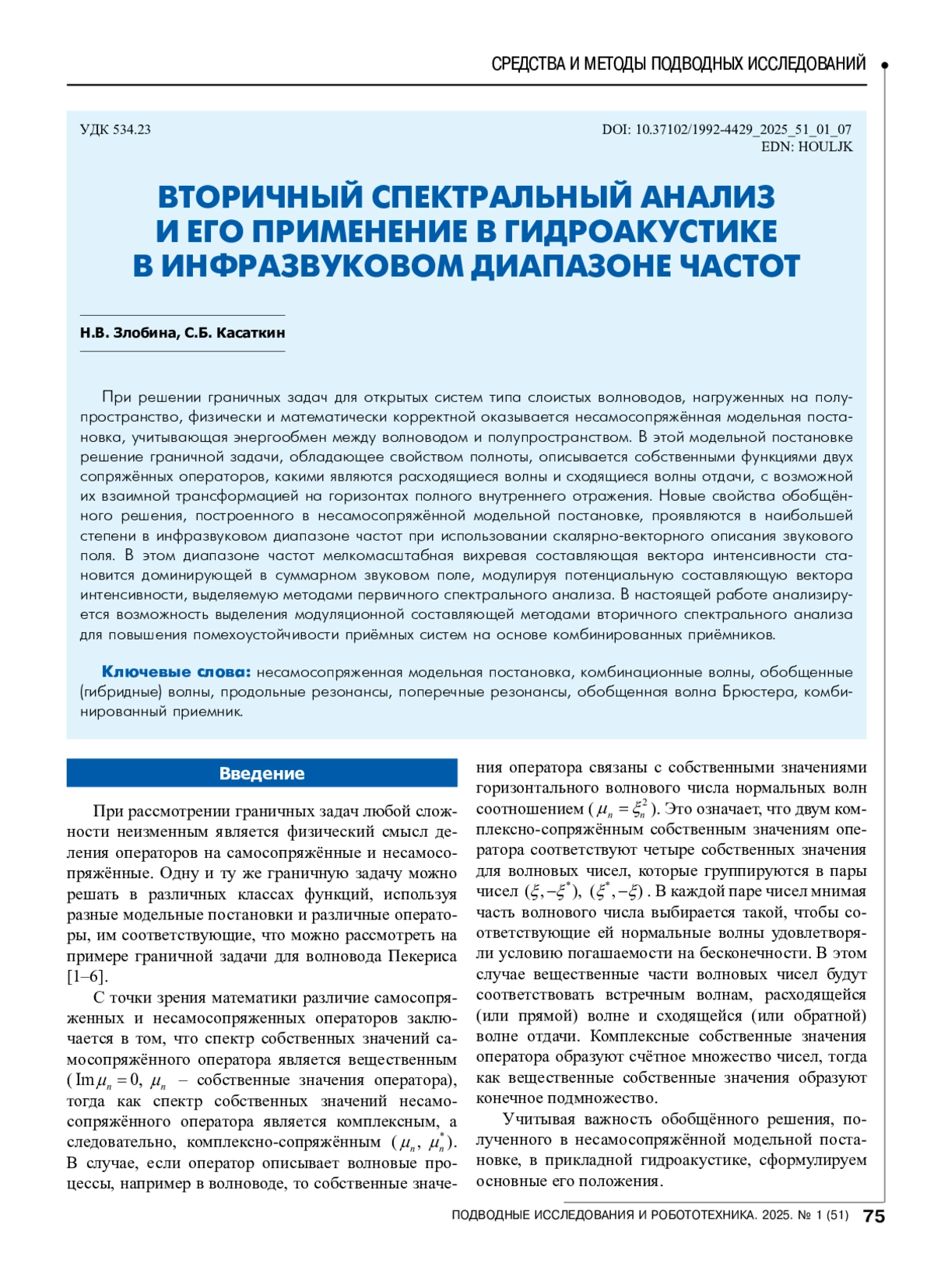 Статья: ВТОРИЧНЫЙ СПЕКТРАЛЬНЫЙ АНАЛИЗ И ЕГО ПРИМЕНЕНИЕ В ГИДРОАКУСТИКЕ В ИНФРАЗВУКОВОМ ДИАПАЗОНЕ ЧАСТОТ (2025)