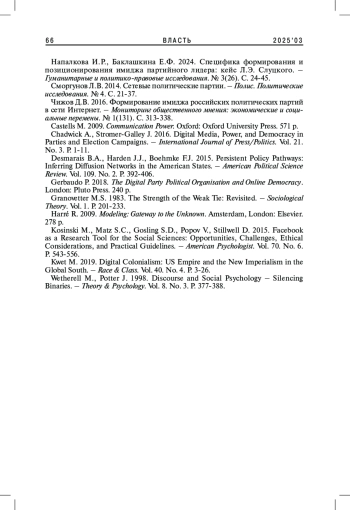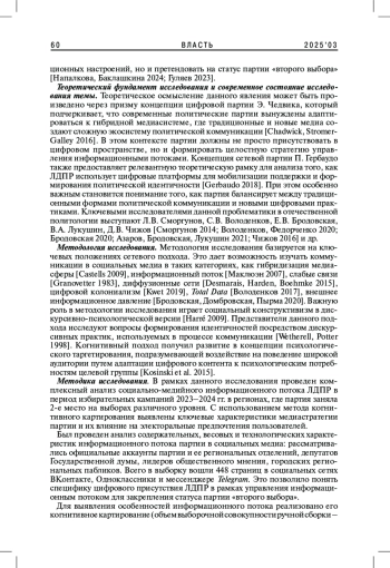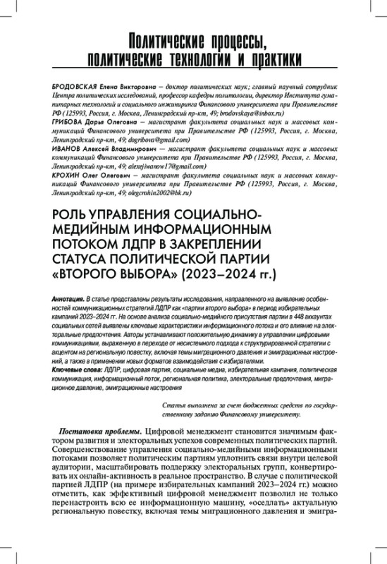 БРОДОВСКАЯ Е. В., ГРИБОВА Д. О., ИВАНОВ А. В., КРОХИН О. О. РОЛЬ УПРАВЛЕНИЯ СОЦИАЛЬНО-МЕДИЙНЫМ ИНФОРМАЦИОННЫМ ПОТОКОМ ЛДПР В ЗАКРЕПЛЕНИИ СТАТУСА ПОЛИТИЧЕСКОЙ ПАРТИИ «ВТОРОГО ВЫБОРА» (2023-2024 ГГ.) // ВЛАСТЬ. 2025. ТОМ 33 № 3