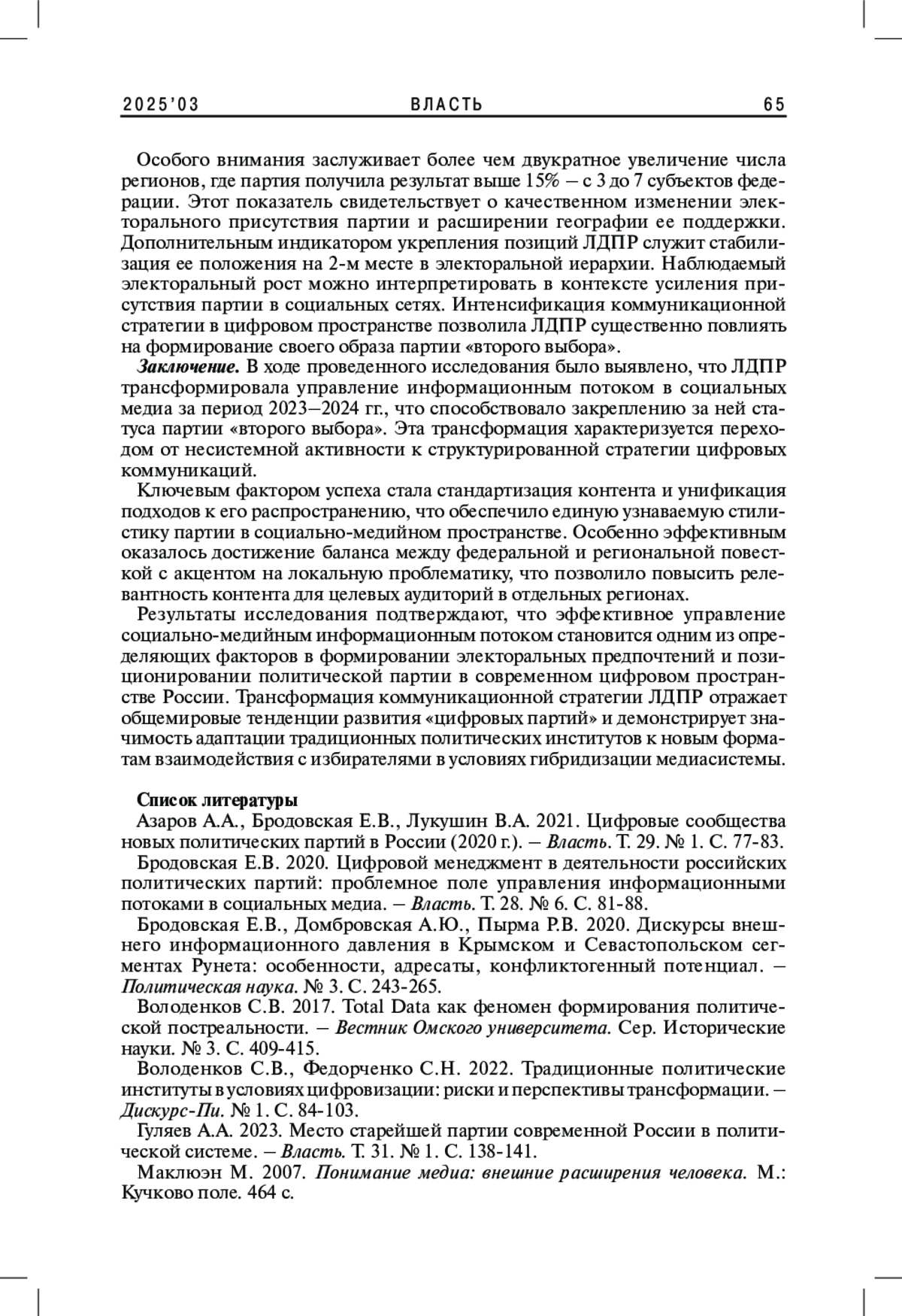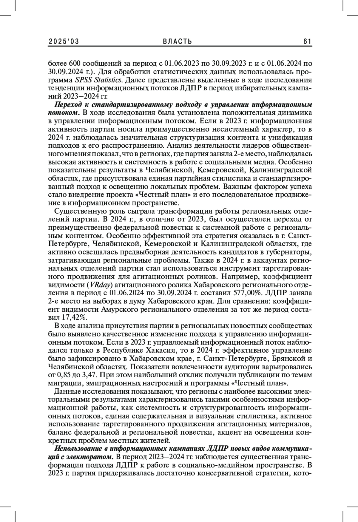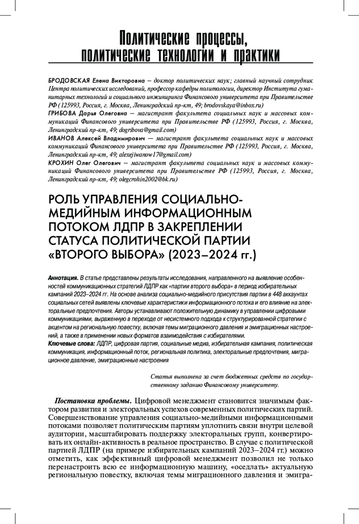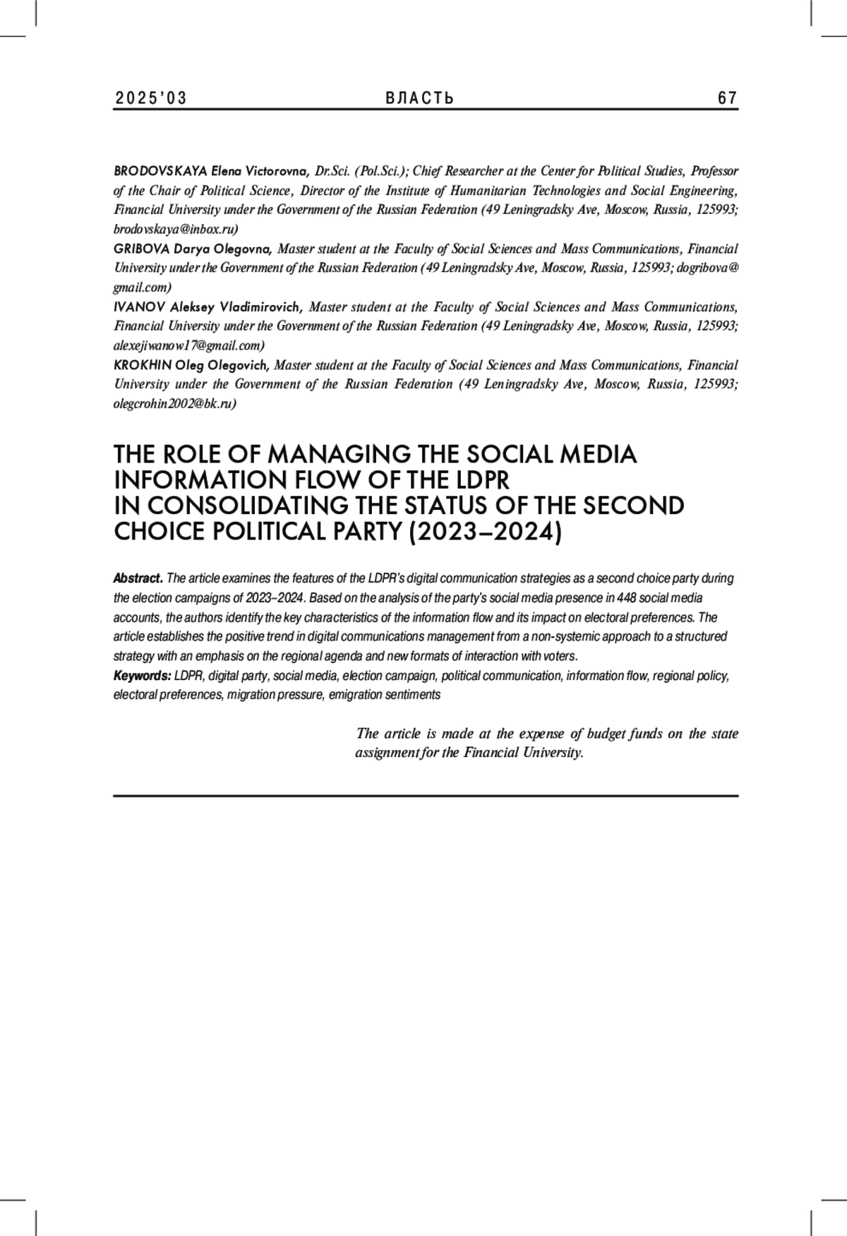 Статья: РОЛЬ УПРАВЛЕНИЯ СОЦИАЛЬНО-МЕДИЙНЫМ ИНФОРМАЦИОННЫМ ПОТОКОМ ЛДПР В ЗАКРЕПЛЕНИИ СТАТУСА ПОЛИТИЧЕСКОЙ ПАРТИИ «ВТОРОГО ВЫБОРА» (2023-2024 ГГ.) (2025)
