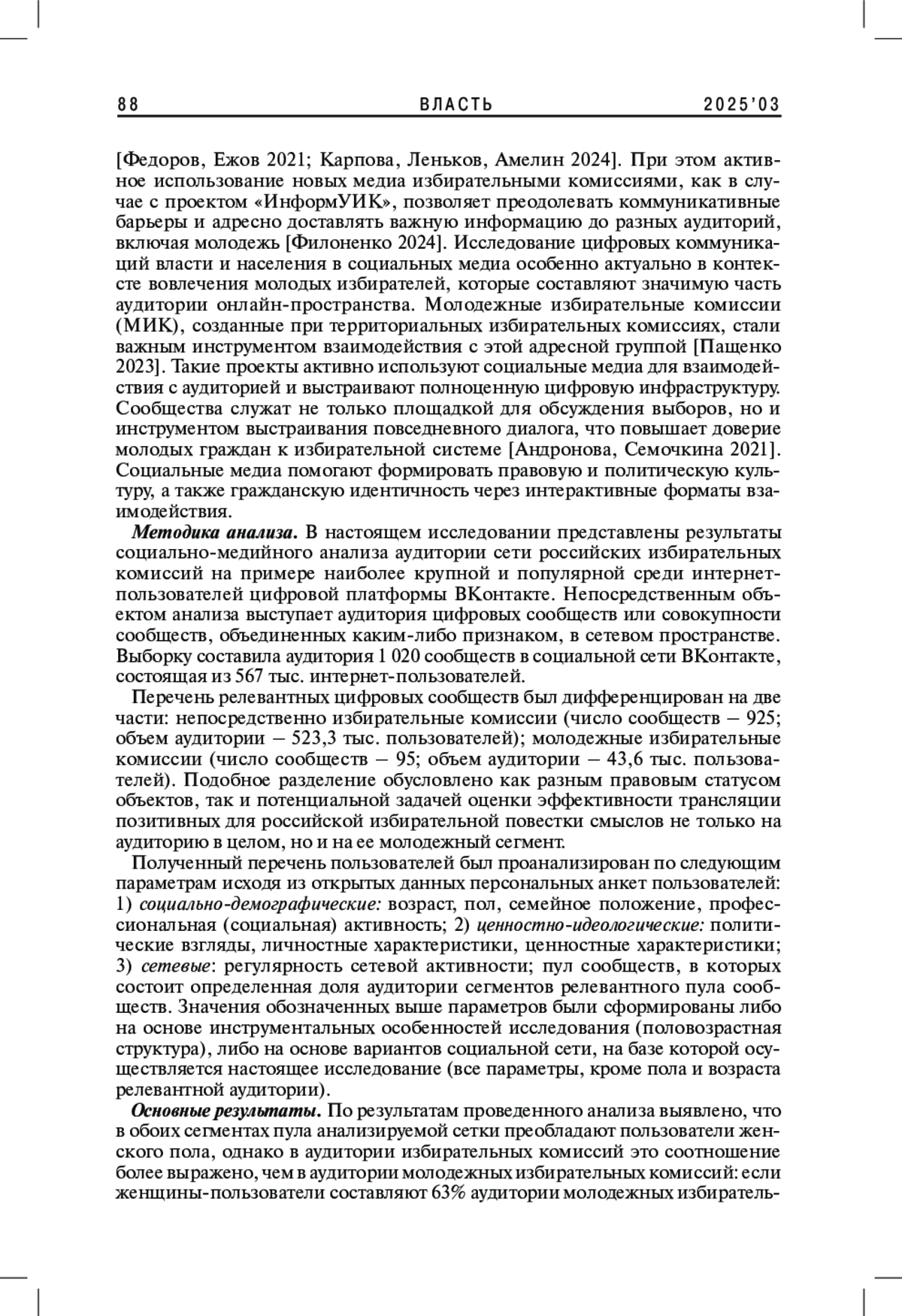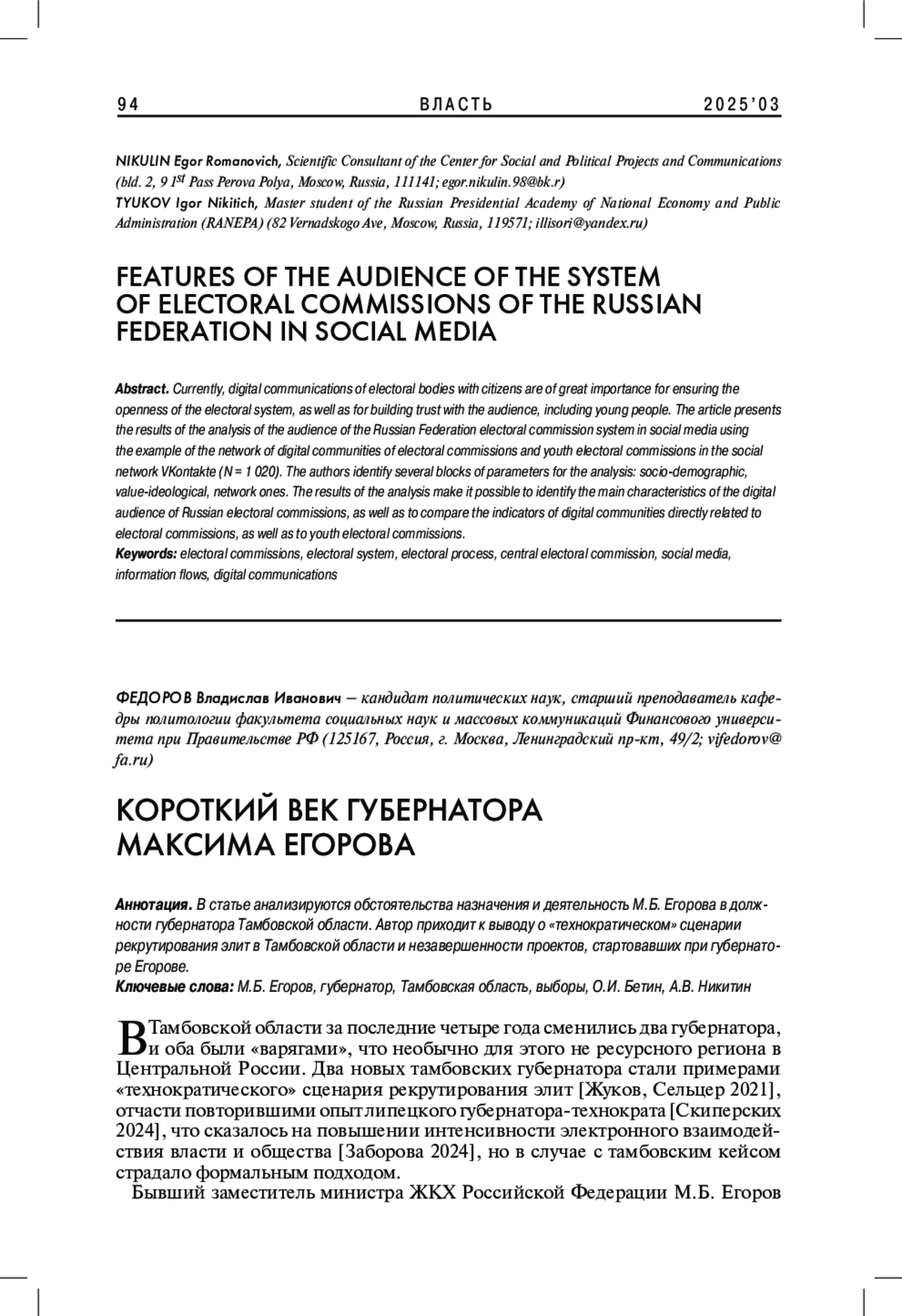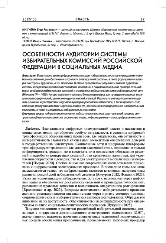 НИКУЛИН Е. Р., ТЮКОВ И. Н. ОСОБЕННОСТИ АУДИТОРИИ СИСТЕМЫ ИЗБИРАТЕЛЬНЫХ КОМИССИЙ РОССИЙСКОЙ ФЕДЕРАЦИИ В СОЦИАЛЬНЫХ МЕДИА // ВЛАСТЬ. 2025. ТОМ 33 № 3