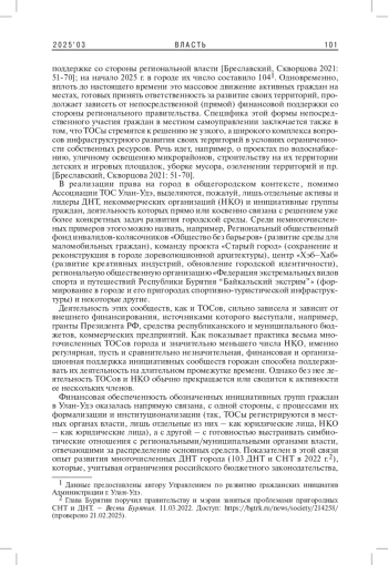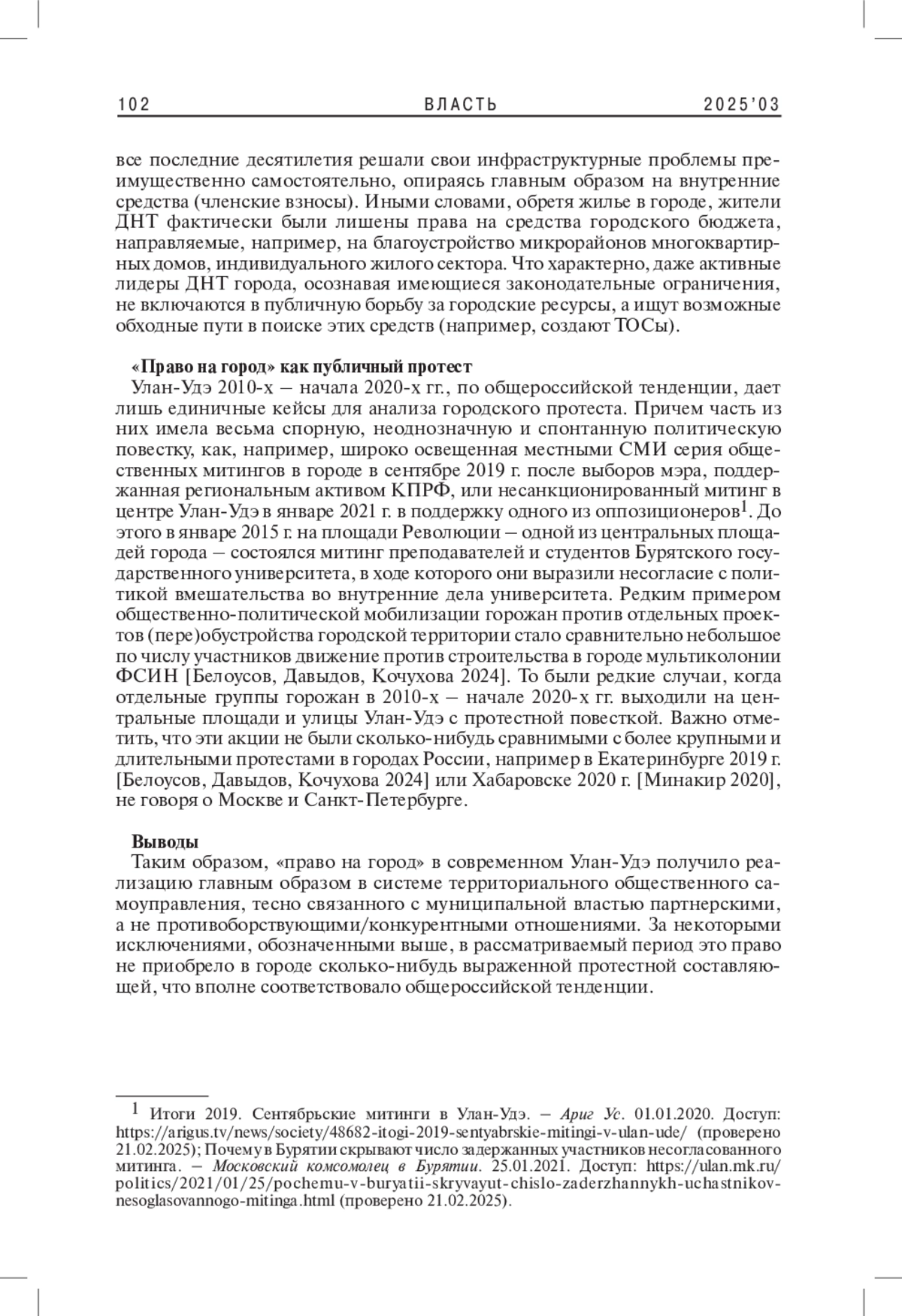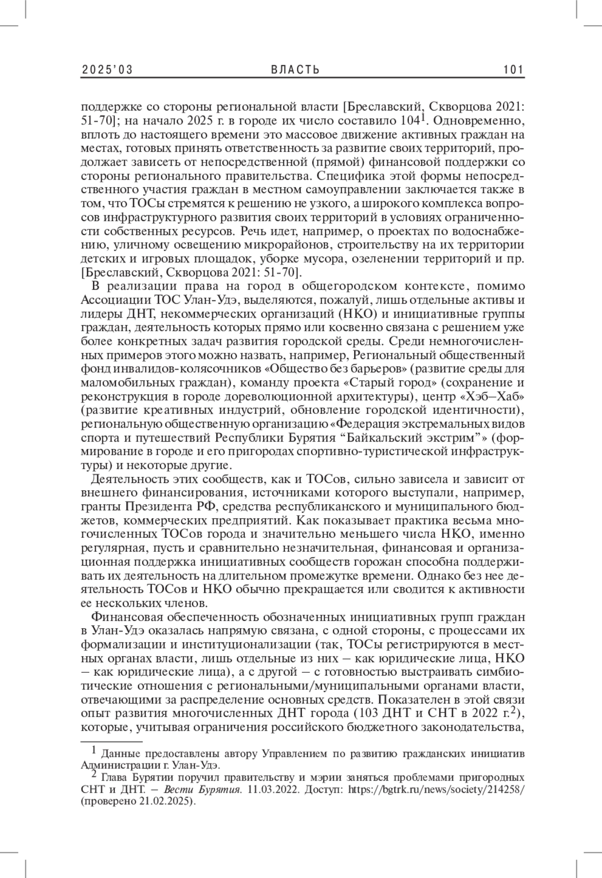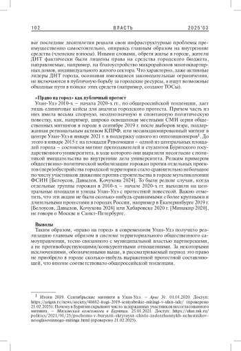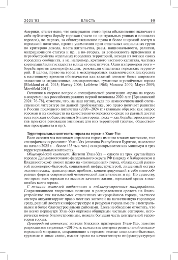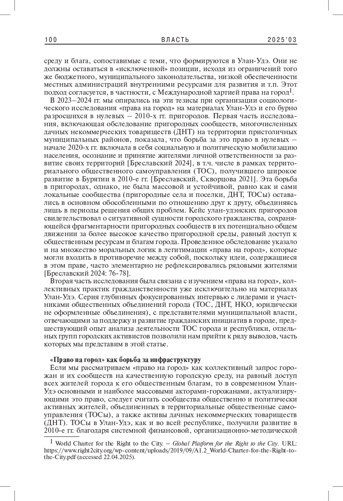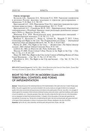 БРЕСЛАВСКИЙ А. С. «ПРАВО НА ГОРОД» В СОВРЕМЕННОМ УЛАН-УДЭ: ТЕРРИТОРИАЛЬНЫЕ КОНТЕКСТЫ И ФОРМЫ РЕАЛИЗАЦИИ // ВЛАСТЬ. 2025. ТОМ 33 № 3