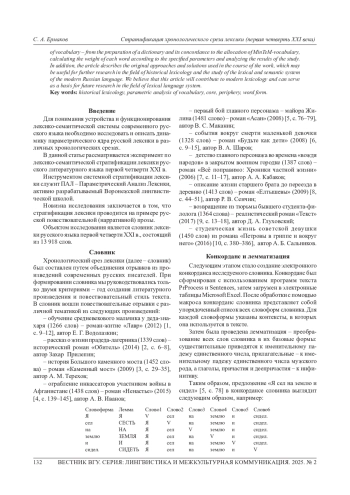 Для понимания устройства и функционирования лексико-семантической системы современного русского языка необходимо исследовать и описать динамику параметрического ядра русской лексики в различных хронологических срезах. В данной статье рассматривается эксперимент по лексико-семантической стратификации лексики русского литературного языка первой четверти XXI в. Инструментом системной стратификации лексики служит ПАЛ – Параметрический Анализ Лексики, активно разрабатываемый Воронежской лингвистической школой. Новизна исследования заключается в том, что стратификация лексики проводится на примере русской повествовательной (нарративной) прозы. Объектом исследования является словник лексики русского языка первой четверти XXI в., состоящий из 13 918 слов.