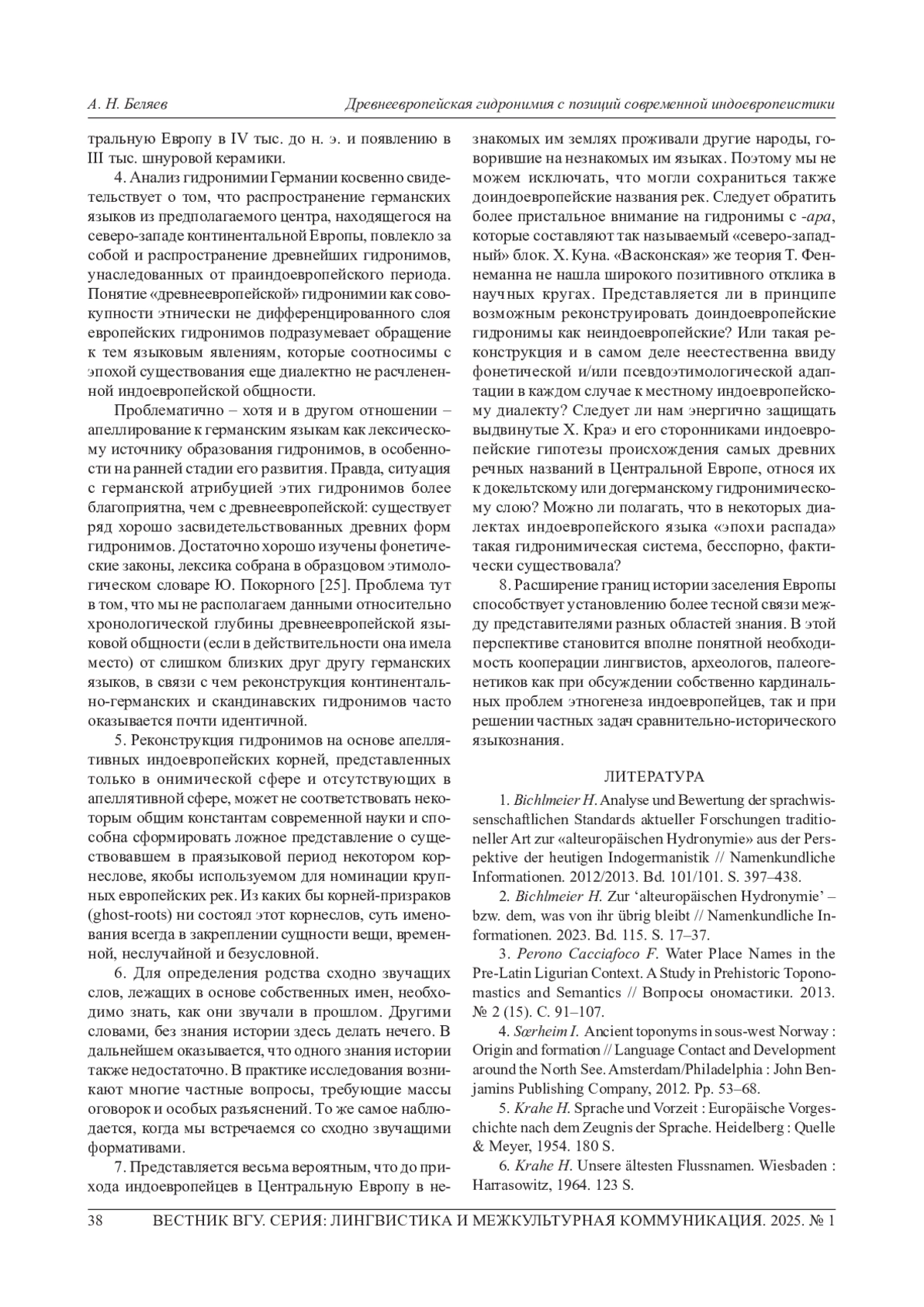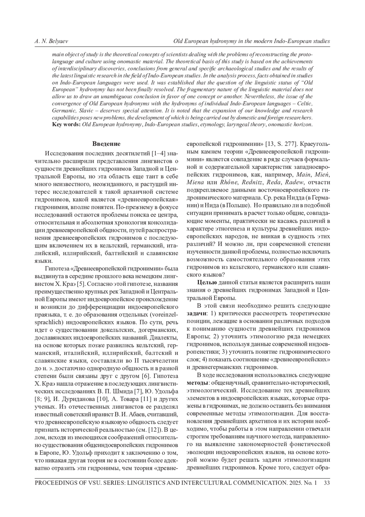 БЕЛЯЕВ А. Н. ДРЕВНЕЕВРОПЕЙСКАЯ ГИДРОНИМИЯ С ПОЗИЦИЙ СОВРЕМЕННОЙ ИНДОЕВРОПЕИСТИКИ // ВЕСТНИК ВОРОНЕЖСКОГО ГОСУДАРСТВЕННОГО УНИВЕРСИТЕТА. СЕРИЯ: ЛИНГВИСТИКА И МЕЖКУЛЬТУРНАЯ КОММУНИКАЦИЯ. 2025. № 1