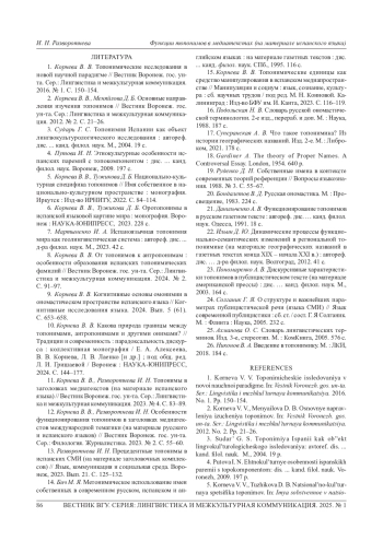 11. Корнева В. В., Разворотнева И. Н. Топонимы в заголовках медиатекстов (на материале испанского языка)//Вестник Воронеж, гос. ун-та. Сер.: Лингвистика и межкультурная коммуникация. 2023. № 4. С. 83-89.