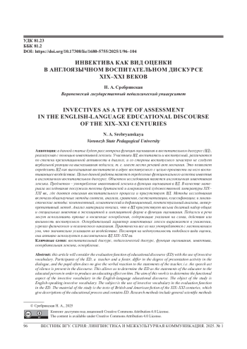Статья: ИНВЕКТИВА КАК ВИД ОЦЕНКИ В АНГЛОЯЗЫЧНОМ ВОСПИТАТЕЛЬНОМ ДИСКУРСЕ XIX-XXI ВЕКОВ (2025)