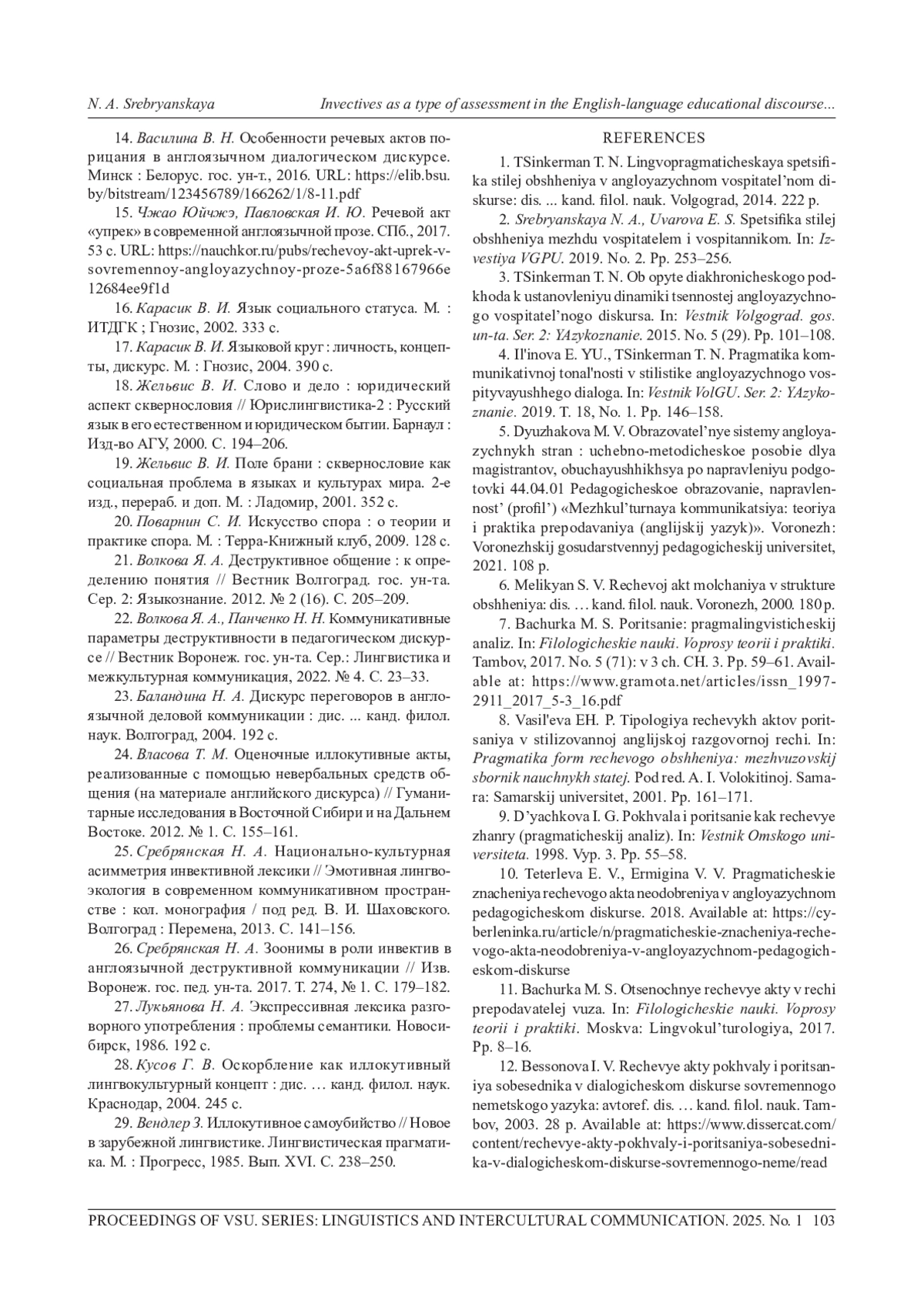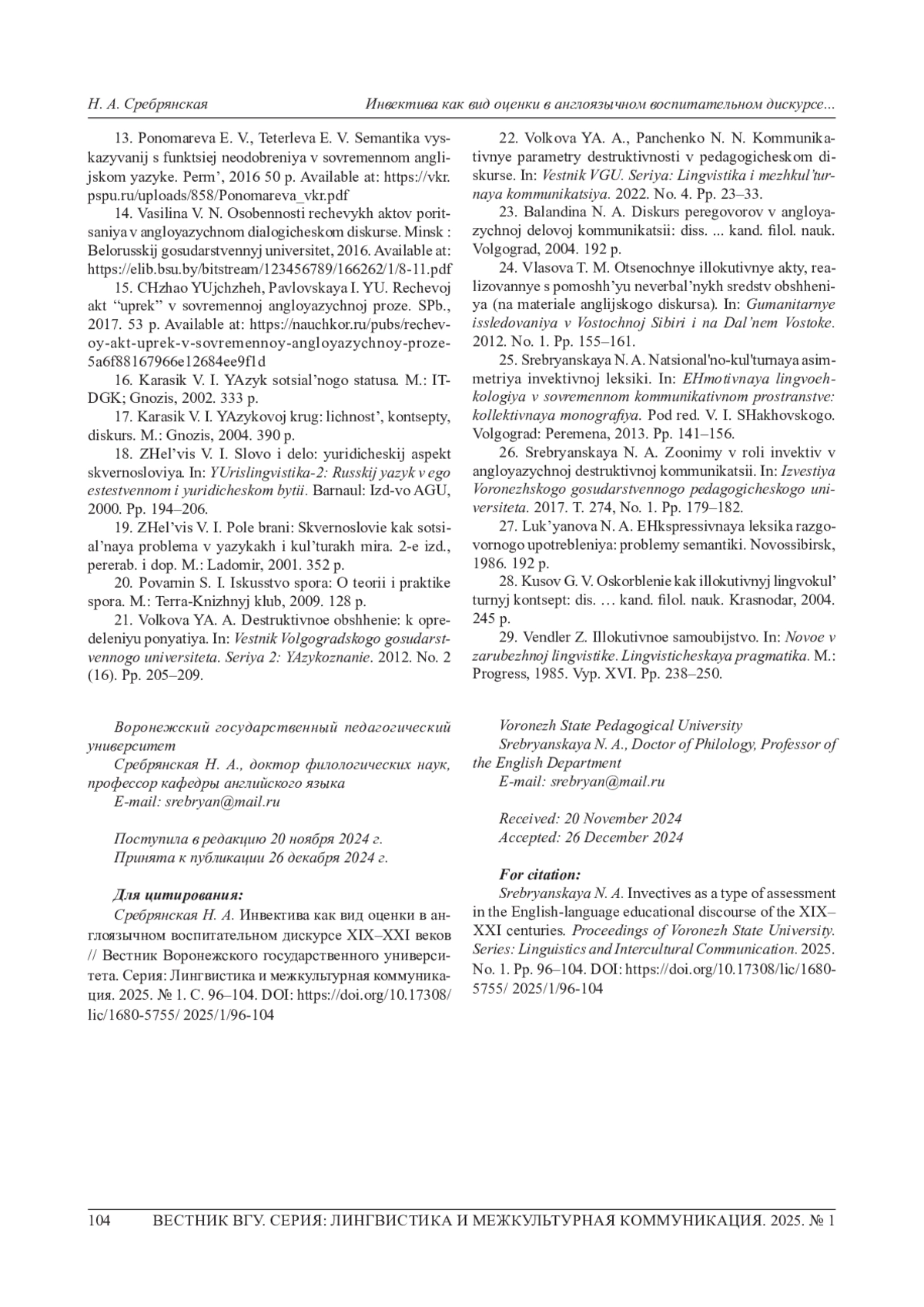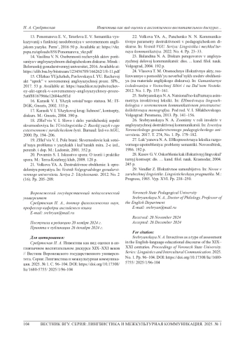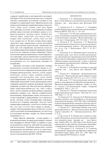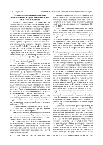 СРЕБРЯНСКАЯ Н. А. ИНВЕКТИВА КАК ВИД ОЦЕНКИ В АНГЛОЯЗЫЧНОМ ВОСПИТАТЕЛЬНОМ ДИСКУРСЕ XIX-XXI ВЕКОВ // ВЕСТНИК ВОРОНЕЖСКОГО ГОСУДАРСТВЕННОГО УНИВЕРСИТЕТА. СЕРИЯ: ЛИНГВИСТИКА И МЕЖКУЛЬТУРНАЯ КОММУНИКАЦИЯ. 2025. № 1