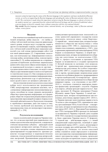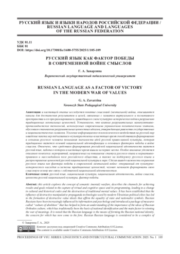 В настоящей статье исследуется понятие смысловой (ментальной) войны, описываются каналы для достижения результатов и целей, связанных с захватом виртуального и когнитивного пространства и его программированием, приводящим к смене культурно-исторических кодов и разрушению традиционных ментальных ценностей. Установлено, что влияние разрушительных манипулятивно-пропагандистских технологий, используемых современными украинскими политическими элитами, обусловило становление разрушительнъыхценностнъых идеалов, утверждающих равенство государственных и националистических символов. Усиление информационно-психологического воздействия на русский мир и введение пакетамер под названием «культура отмены» в настоящее время способствовали формированию в сознании русского человека понимания значимости идей русской православной культуры, которая традиционно является основой национальной идентификации и основным фактором победы в войне смыслов. Отмечено, что средством формирования российской национальной идентичности является русский язык, забота о котором в настоящее время вышла на первое место. Особое внимание уделяется описанию комплекса мероприятий, направленных на повышение статуса русского языка в нормативноправовом и массмедийном поле российского общества, а также на поддержку русского языка и распространение ценностей русской национальной культуры в мире. Сделан вывод о важности сохранения русского языка как фактора победы в современной ментальной войне: оторванный от культурноисторического наследия и системы традиционных ценностей, человек начинает формировать свою смысловую основу вне связи с собственной национальной идентичностью.