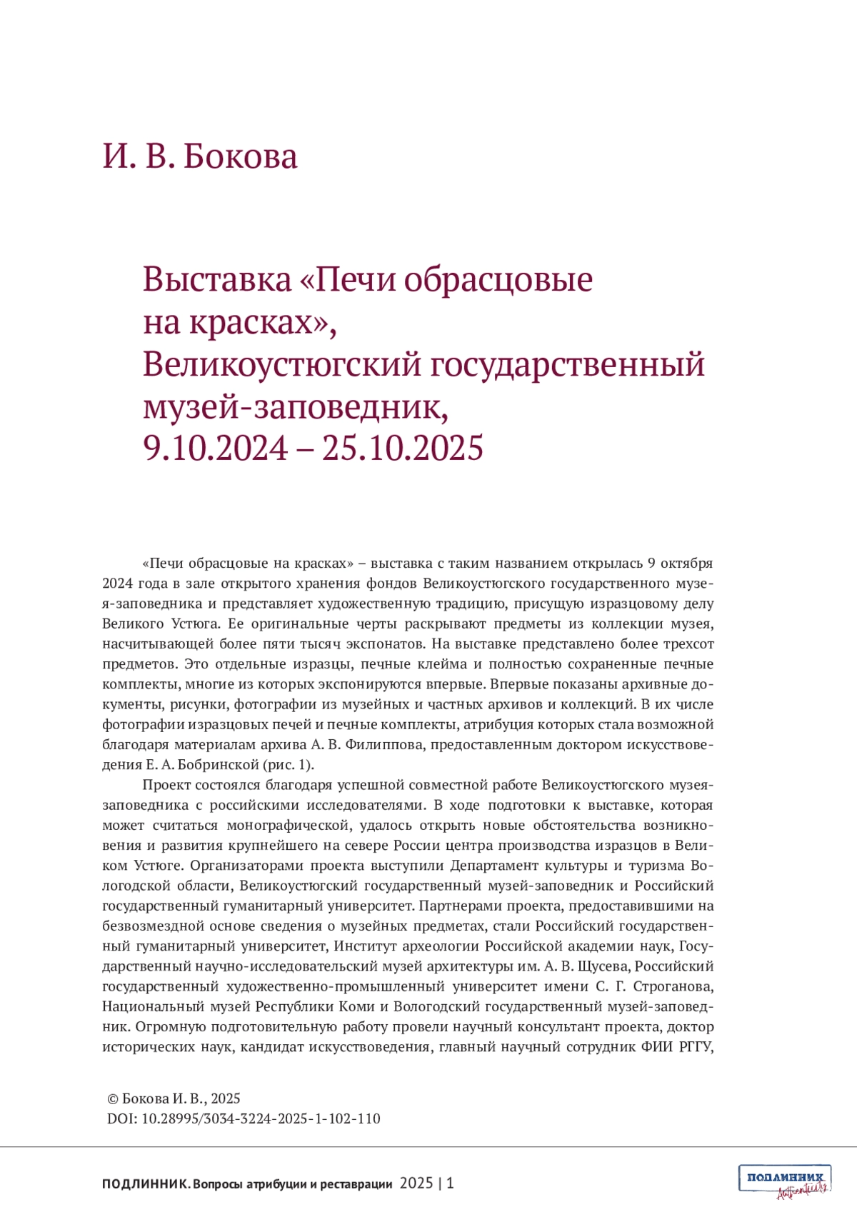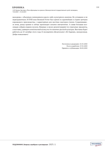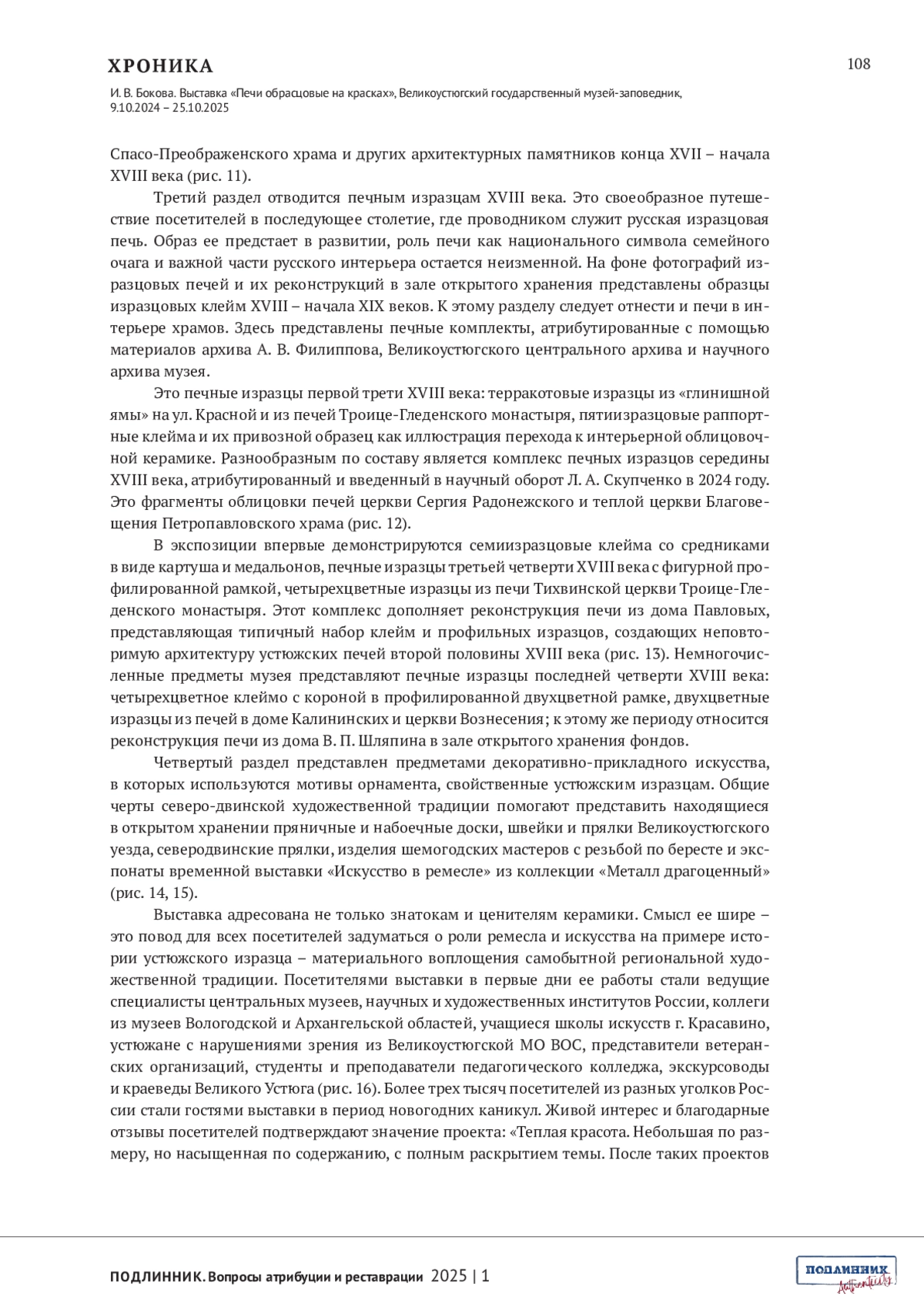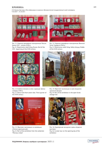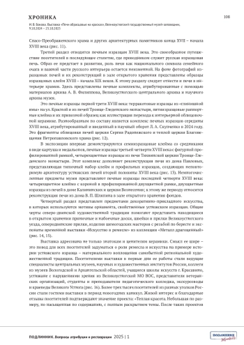 БОКОВА И.В. ВЫСТАВКА «ПЕЧИ ОБРАСЦОВЫЕ НА КРАСКАХ», ВЕЛИКОУСТЮГСКИЙ ГОСУДАРСТВЕННЫЙ МУЗЕЙ-ЗАПОВЕДНИК, 9.10.2024 - 25.10.2025 // ПОДЛИННИК. ВОПРОСЫ АТРИБУЦИИ И РЕСТАВРАЦИИ. 2025. № 1 (5)