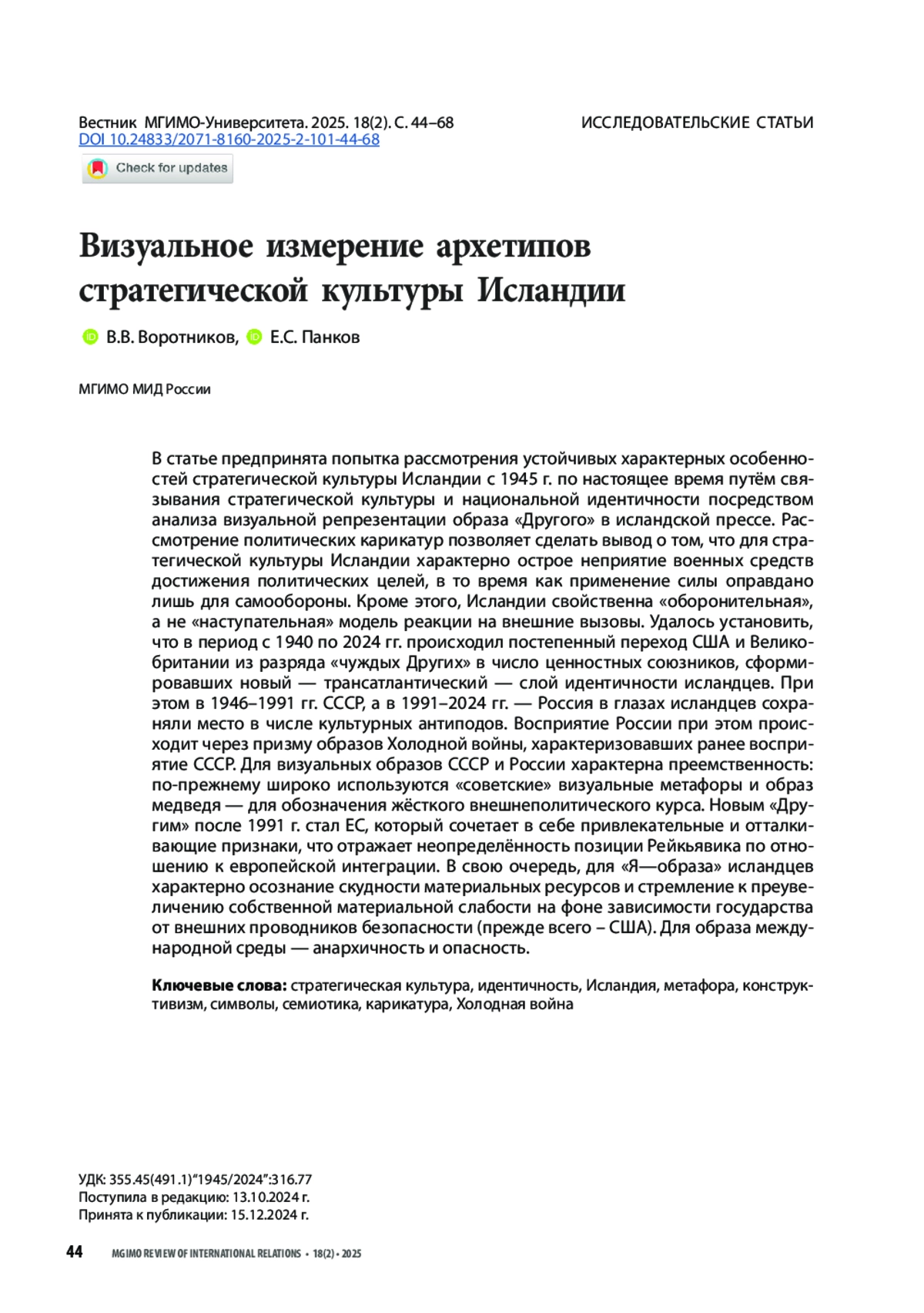 36. Кучеров М.А., Харкевич М.В. 2023. «Народная секьюритизация»: визуальный поворот в исследованиях безопасности. Вестник Московского университета. Серия 25: Международные отношения и мировая политика. 15(4). С. 61-83. https://doi.org/10.48015/2076-7404-2023-154-61-83.