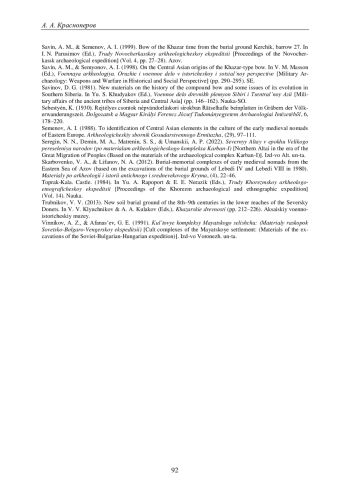 25. Савин A.M., Семенов А.И. О центрально-азиатских истоках лука хазарского типа // Военная археология. Оружие и военное дело в исторической и социальной перспективе / отв. ред. В.М. Массон. СПб.: ГЭ, 1998. С. 290-295.