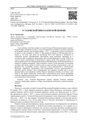 Поводом к изучению истории Тазовской Николаевской церкви послужило одно событие. В декабре 2023 г. Дума Красноселькупского района Ямало-Ненецкого автономного округа приняла решение считать датой основания районного центра села Красноселькуп не 1937 г., как признавалось ранее, а 1897 г., когда статистическая перепись населения народов России зафиксировала рядом с Тазовской Николаевской церковью станок Церковенск (Об установлении даты…, 2023, с. 6). Для справки: Тазовская Николаевская церковь и поселок при ней располагались на берегу р. Таз в 20 км выше устья р. Худосей; расстояние от Церковенска до Красноселькупа составляло 40 км вниз по Тазу.