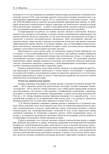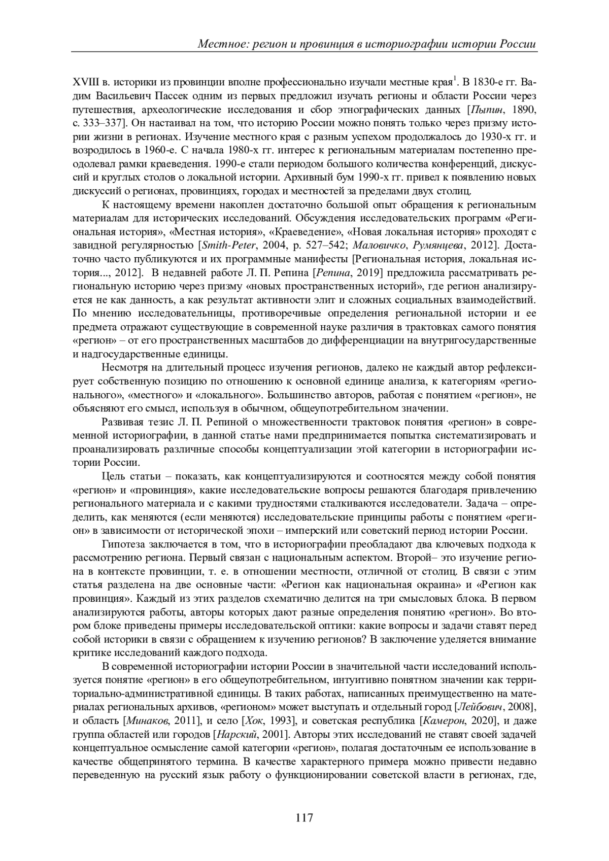 Статья посвящена исследованию категории «регион» в современной историографии истории России и особенностям ее концептуализации в исследовательской практике. Анализируются ключевые подходы к определению данного понятия, выделяя два основных направления: регион как национальная окраина и регион как провинция. В рамках первого подхода регион рассматривается в тесной связи с понятиями «нация», «этнос» и «национальная окраина», где акцент делается на взаимоотношениях центра и периферии в контексте национальной и административной политики. Второй подход определяет регион через противопоставление столице, где все, что находится за ее пределами, понимается как провинция. В статье подробно рассмотрены исследовательские программы и методологические принципы каждого направления, работы как отечественных, так и зарубежных историков. Особое внимание уделяется эволюции понимания региона в зависимости от изучаемого исторического периода - имперского или советского. В статье демонстрируется, как региональный ракурс позволяет не только дополнить традиционный «столичный» взгляд на историю России, но и критически пересмотреть устоявшиеся историографические концепции. Прослеживается развитие регионального подхода с конца XVIII в. до современности, выявляются изменения в трактовке «местного» в различных исследовательских традициях. В заключении сделан вывод о том, что, несмотря на длительные дискуссии вокруг понятия «регион», эта категория часто используется без должной рефлексии, а ее содержание существенно варьируется в зависимости от конкретных исследовательских задач, исторического контекста и методологических предпочтений ученых.