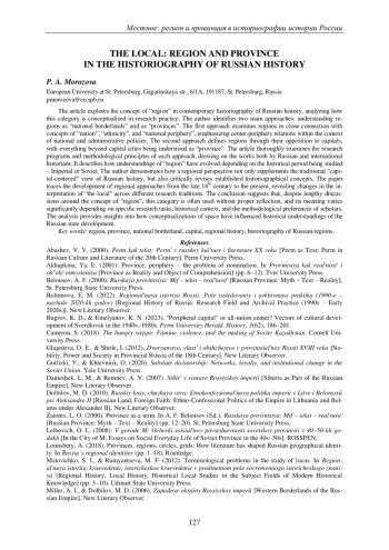 40. Smith-Peter S. Bringing the Provinces into Focus: Subnational Spaces in the Recent Historiography of Russia // Kritika: Explorations in Russian and Eurasian History. 2011. Vol. 12, no. 4. P. 835-848. DOI: 10.1353/kri.2011.0052 EDN: XZXKRS