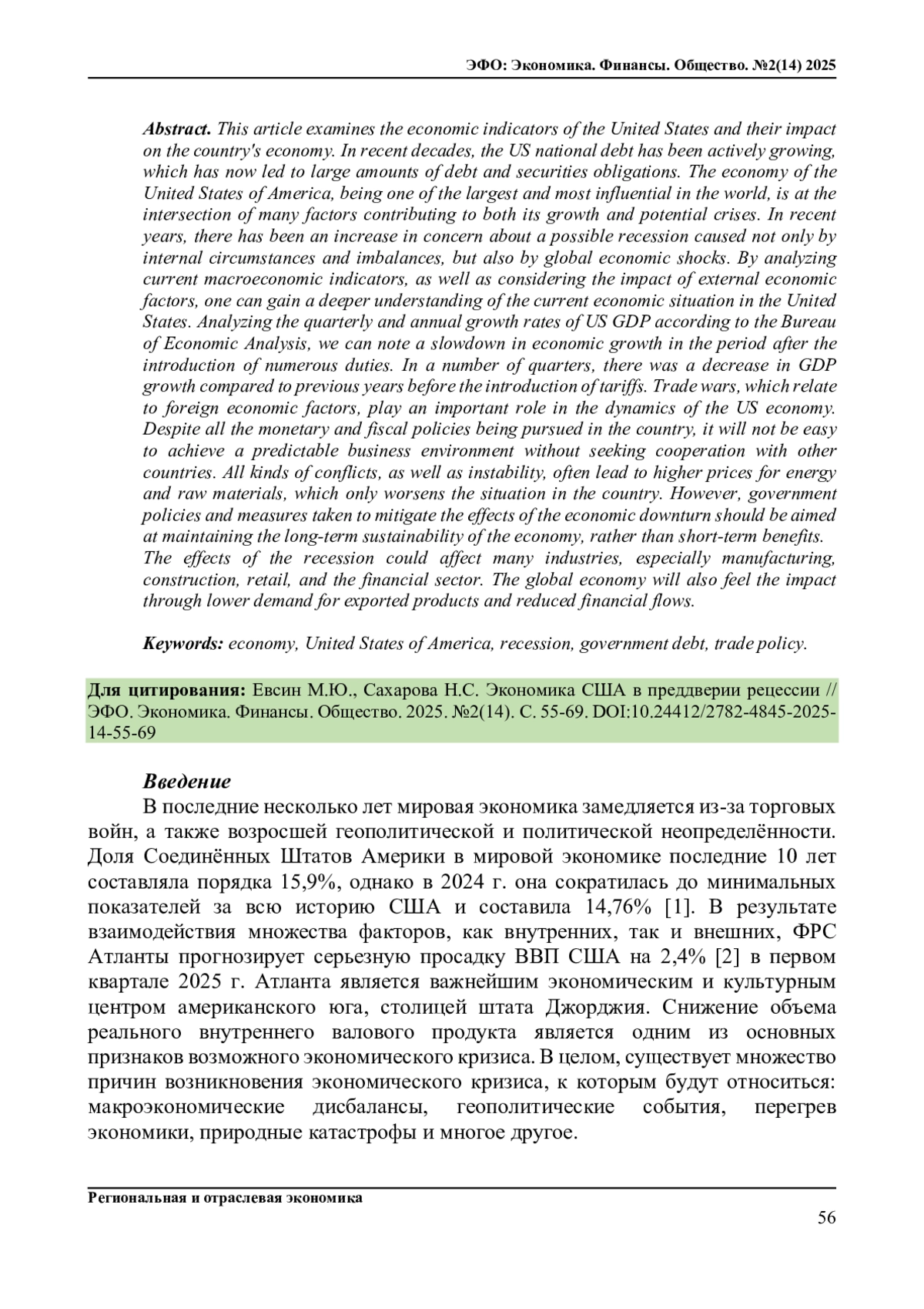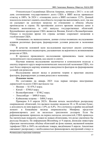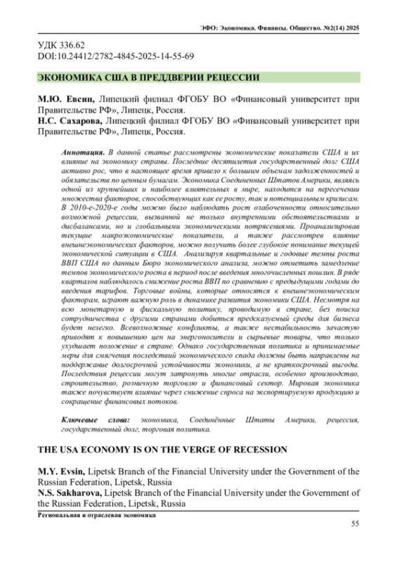В данной статье рассмотрены экономические показатели США и их влияние на экономику страны. Последние десятилетия государственный долг США активно рос, что в настоящее время привело к большим объемам задолженностей и обязательств по ценным бумагам. Экономика Соединенных Штатов Америки, являясь одной из крупнейших и наиболее влиятельных в мире, находится на пересечении множества факторов, способствующих как ее росту, так и потенциальным кризисам. В 2010-е-2020-е годы можно было наблюдать рост озабоченности относительно возможной рецессии, вызванной не только внутренними обстоятельствами и дисбалансами, но и глобальными экономическими потрясениями. Проанализировав текущие макроэкономические показатели, а также рассмотрев влияние внешнеэкономических факторов, можно получить более глубокое понимание текущей экономической ситуации в США. Анализируя квартальные и годовые темпы роста ВВП США по данным Бюро экономического анализа, можно отметить замедление темпов экономического роста в период после введения многочисленных пошлин. В ряде кварталов наблюдалось снижение роста ВВП по сравнению с предыдущими годами до введения тарифов. Торговые войны, которые относятся к внешнеэкономическим факторам, играют важную роль в динамике развития экономики США. Несмотря на всю монетарную и фискальную политику, проводимую в стране, без поиска сотрудничества с другими странами добиться предсказуемый среды для бизнеса будет нелегко. Всевозможные конфликты, а также нестабильность зачастую приводят к повышению цен на энергоносители и сырьевые товары, что только ухудшает положение в стране. Однако государственная политика и принимаемые меры для смягчения последствий экономического спада должны быть направлены на поддержание долгосрочной устойчивости экономики, а не краткосрочный выгоды. Последствия рецессии могут затронуть многие отрасли, особенно производство, строительство, розничную торговлю и финансовый сектор. Мировая экономика также почувствует влияние через снижение спроса на экспортируемую продукцию и сокращение финансовых потоков.