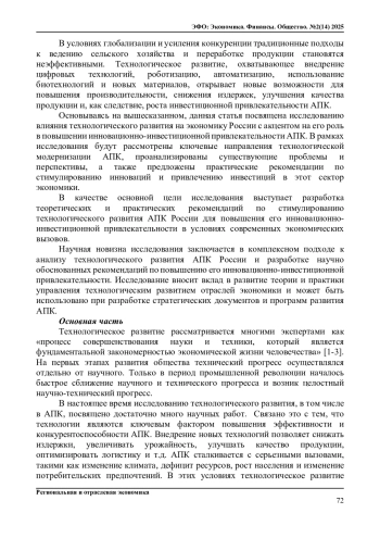 Статья: ТЕХНОЛОГИЧЕСКОЕ РАЗВИТИЕ ЭКОНОМИКИ РОССИИ КАК ОСНОВА ПОВЫШЕНИЯ ИННОВАЦИОННО-ИНВЕСТИЦИОННОЙ ПРИВЛЕКАТЕЛЬНОСТИ АПК (2025)