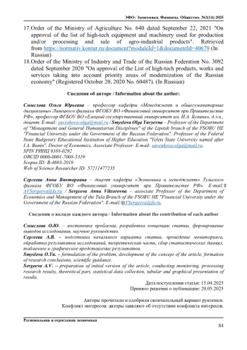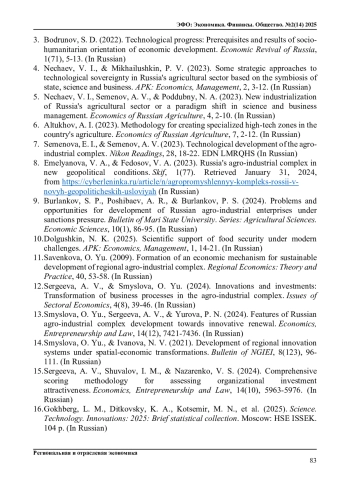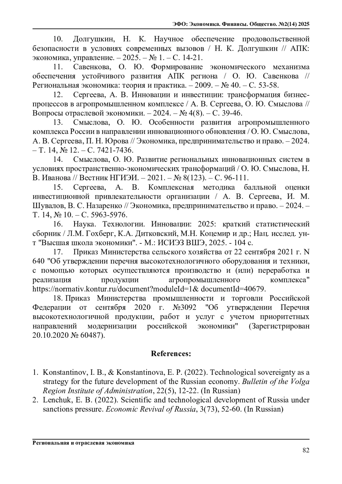СМЫСЛОВА О. Ю., СЕРГЕЕВА А. В. ТЕХНОЛОГИЧЕСКОЕ РАЗВИТИЕ ЭКОНОМИКИ РОССИИ КАК ОСНОВА ПОВЫШЕНИЯ ИННОВАЦИОННО-ИНВЕСТИЦИОННОЙ ПРИВЛЕКАТЕЛЬНОСТИ АПК // ЭФО: ЭКОНОМИКА. ФИНАНСЫ. ОБЩЕСТВО. 2025. № 2 (14)