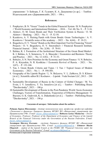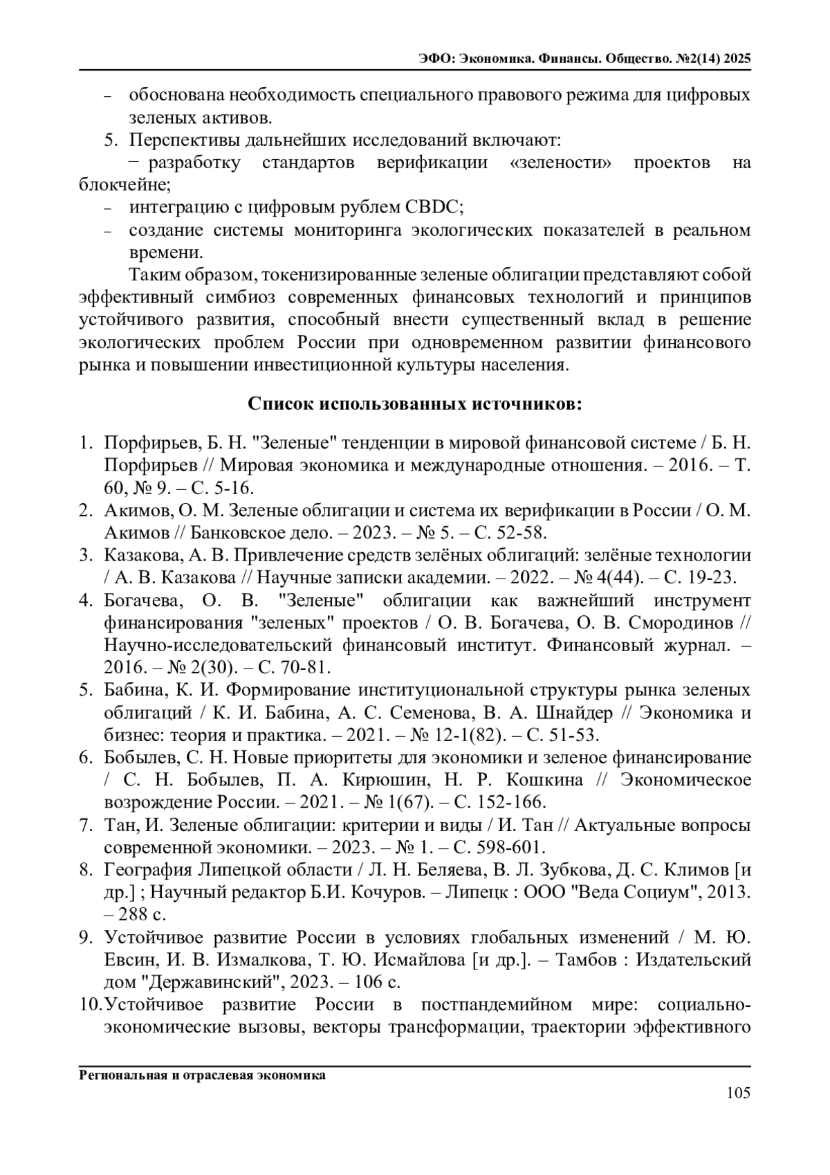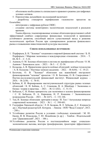 1. Порфирьев, Б. Н. “Зеленые” тенденции в мировой финансовой системе / Б. Н. Порфирьев // Мировая экономика и международные отношения. - 2016. - Т. 60, № 9. - С. 5-16.