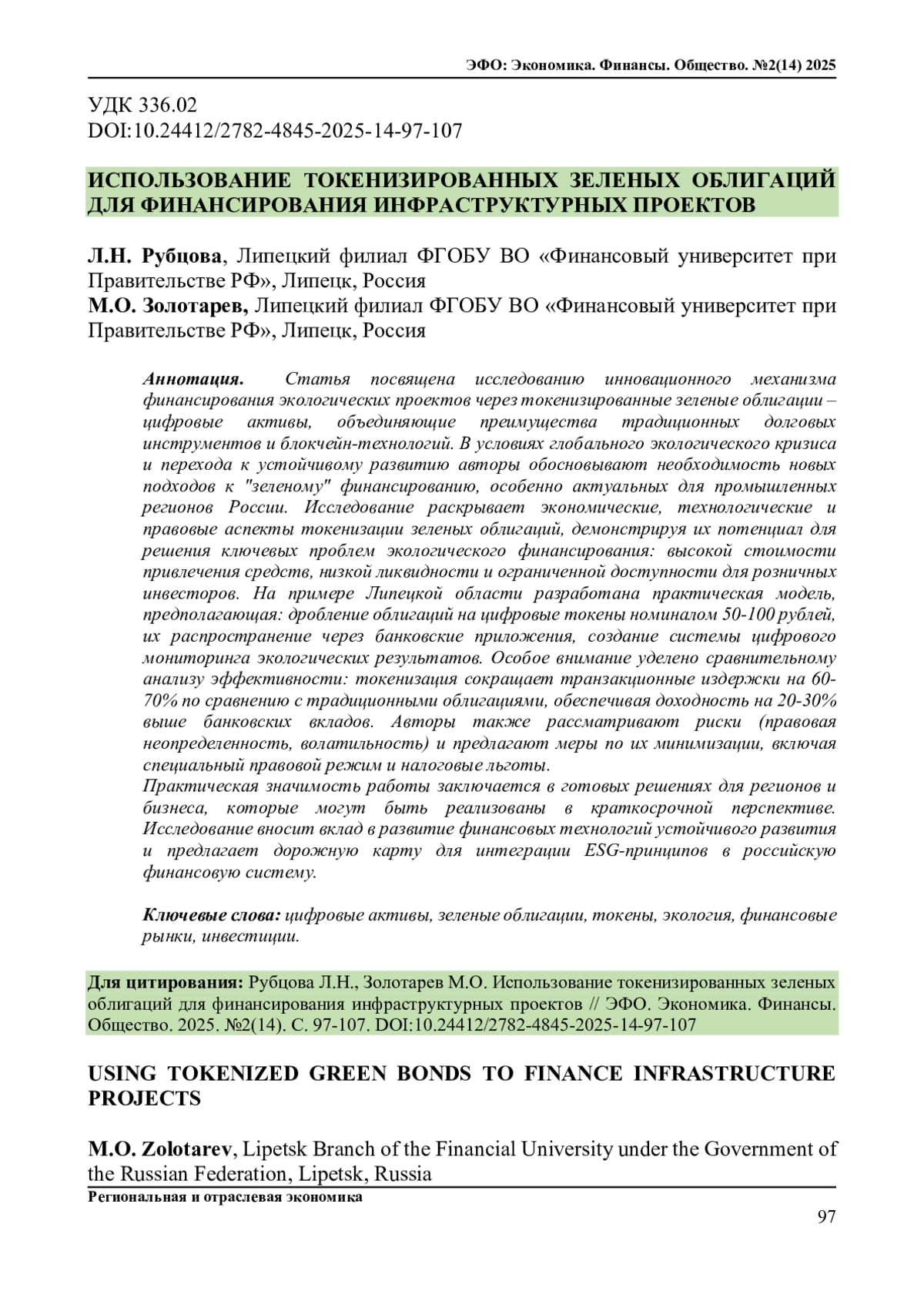 Статья посвящена исследованию инновационного механизма финансирования экологических проектов через токенизированные зеленые облигации – цифровые активы, объединяющие преимущества традиционных долговых инструментов и блокчейн-технологий. В условиях глобального экологического кризиса и перехода к устойчивому развитию авторы обосновывают необходимость новых подходов к “зеленому” финансированию, особенно актуальных для промышленных регионов России. Исследование раскрывает экономические, технологические и правовые аспекты токенизации зеленых облигаций, демонстрируя их потенциал для решения ключевых проблем экологического финансирования: высокой стоимости привлечения средств, низкой ликвидности и ограниченной доступности для розничных инвесторов. На примере Липецкой области разработана практическая модель, предполагающая: дробление облигаций на цифровые токены номиналом 50-100 рублей, их распространение через банковские приложения, создание системы цифрового мониторинга экологических результатов. Особое внимание уделено сравнительному анализу эффективности: токенизация сокращает транзакционные издержки на 60- 70% по сравнению с традиционными облигациями, обеспечивая доходность на 20-30% выше банковских вкладов. Авторы также рассматривают риски (правовая неопределенность, волатильность) и предлагают меры по их минимизации, включая специальный правовой режим и налоговые льготы.