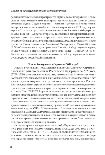 Вопрос о ходе и результатах агломерационных процессов по-прежнему остается одним из центральных в оценке проблем и перспектив российской экономики. Следует предположить, что значимость этого вопроса в предстоящий период будет только возрастать. Ситуация последних нескольких лет выявила полный провал расчетов на то, что широкомасштабные санкции в отношении России заставят страну полностью сосредоточиться на решении задач текущего, даже неотложного характера. Сегодня очевидна способность российской экономики ставить и решать стратегические задачи на длительную перспективу. Это подтвердили целевые установки, данные в новой стратегии пространственного развития страны до 2030 года и на перспективу до 2036 года. Агломерации представляют собой тот объект стратегического планирования, где в первую очередь востребованы управленческие решения, рассчитанные на долговременный системный эффект как экономического, так социального и иного характера. В этой связи в статье предпринимается попытка показать основные направления эволюции государственной политики в отношении агломерационных процессов; подчеркнуть те новые возможности и задачи, которые будут решаться за счет этих процессов как в отраслевом, так и в пространственном разрезе национальной экономики.