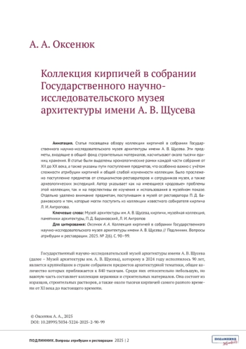 Статья посвящена обзору коллекции кирпичей в собрании Государственного научно-исследовательского музея архитектуры имени А. В. Щусева. Эти предметы, входящие в общий фонд строительных материалов, насчитывают около тысячи единиц хранения. В статье были выделены хронологические рамки каждой части собрания от XII до XX века, а также указаны пути поступления предметов, что особенно важно с учётом сложности атрибуции кирпичей и общей слабой изученности коллекции. Было прослежено поступление предметов от специалистов-реставраторов и сотрудников музея, а также археологических экспедиций. Автор указывает как на имеющиеся «родовые» проблемы этой коллекции, так и на перспективы ее изучения и использования в музейном показе. Отдельно уделено внимание предметам, поступившим в музей от реставратора П. Д. Барановского и тем, которые могли поступить из коллекции известного собирателя кирпича Л. И. Антропова.
